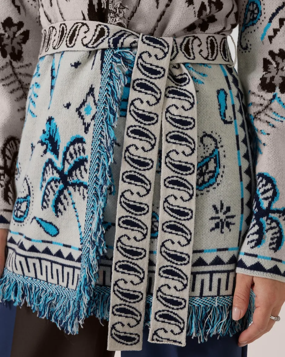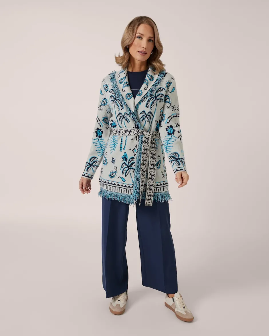 Dieser coole Cardigan von THOM by Thomas Rath ist eine Bereicherung für jede Garderobe. Der trendige Appeal entsteht durch den angesagten Oversize-Look und das fantasievolle Allover-Jacquard-Muster im Ethno-Stil. Der Cardigan in offener Form wird in der Taille mit einem Bindegürtel zusammengehalten. Die frechen Fransenkanten geben der Mode einen Bohème-Charme. Der tolle Designer-Cardigan ist aus einem soften Wolle-Kaschmir-Mix gefertigt und damit ein perfekter Herbst- und Winterbegleiter.