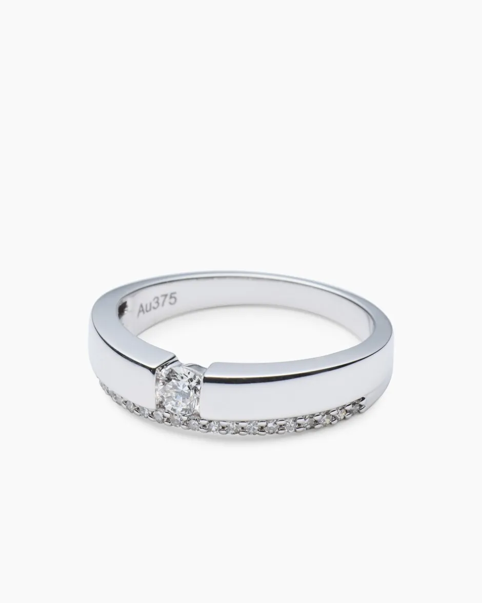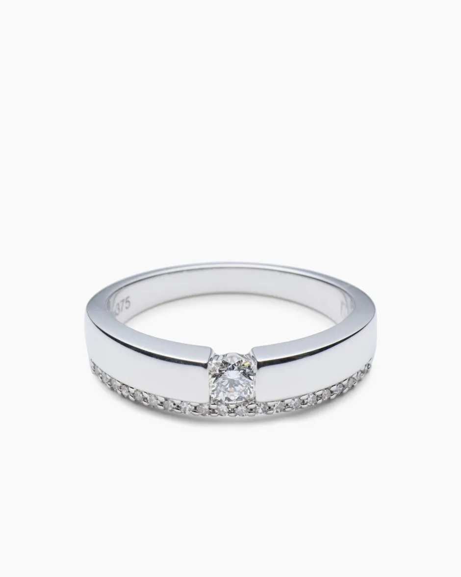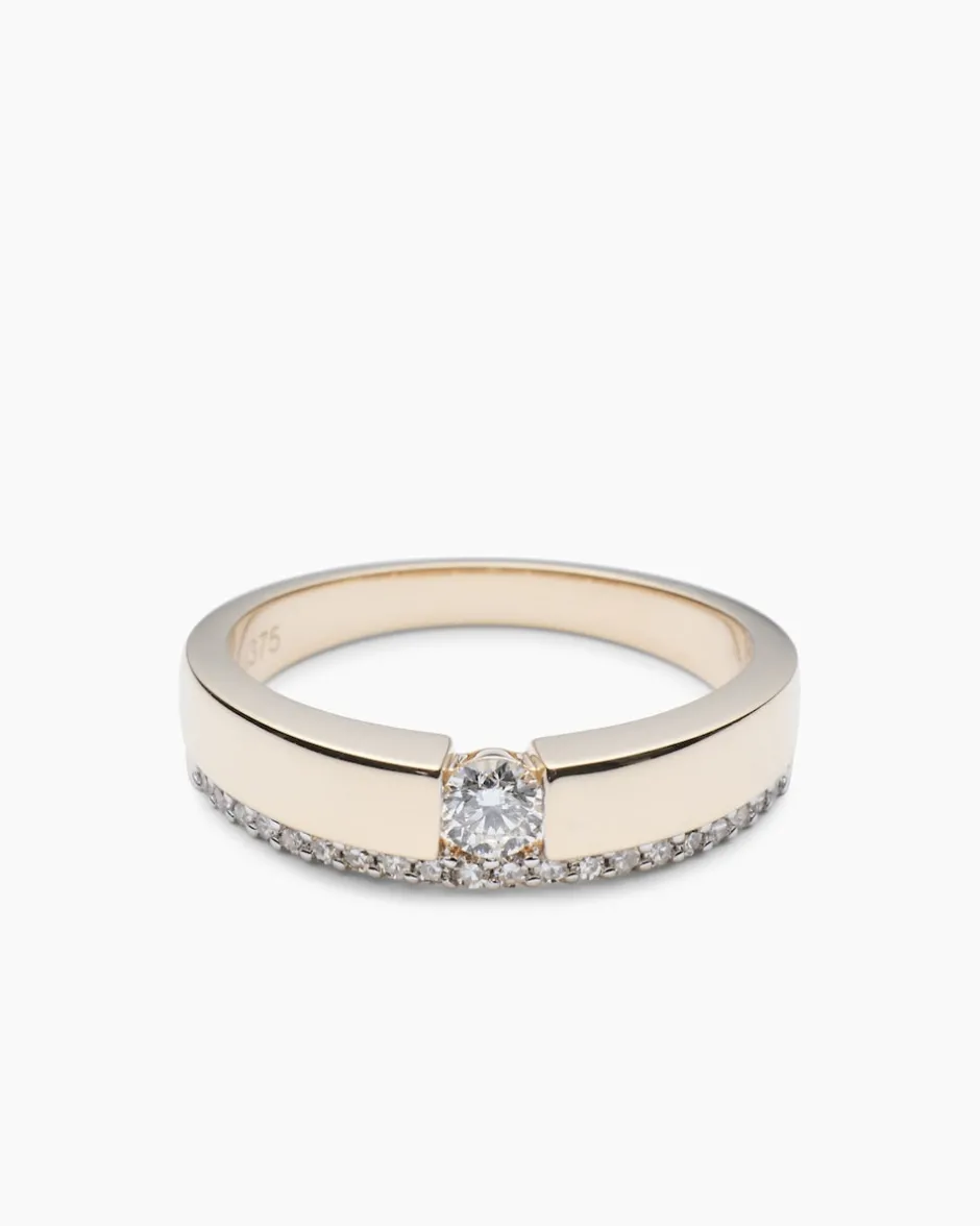 Der aparte und angenehm zu tragende Bandring wird an Ihrem Finger zum luxuriösen Statement. Das Schmuck-Accessoire kombiniert 375er Gelbgold mit zwanzig Diamanten in Krappenfassungen und einem Solitär-Brillanten, der in einer Spannoptikfassung sitzt. Die funkelnden Edelsteine verfügen alle über die Reinheit P1 und sind gut und sehr gut geschliffen. Mit diesem Diamond Collection Ring an Ihrem Finger beweisen Sie Klasse und Eleganz.