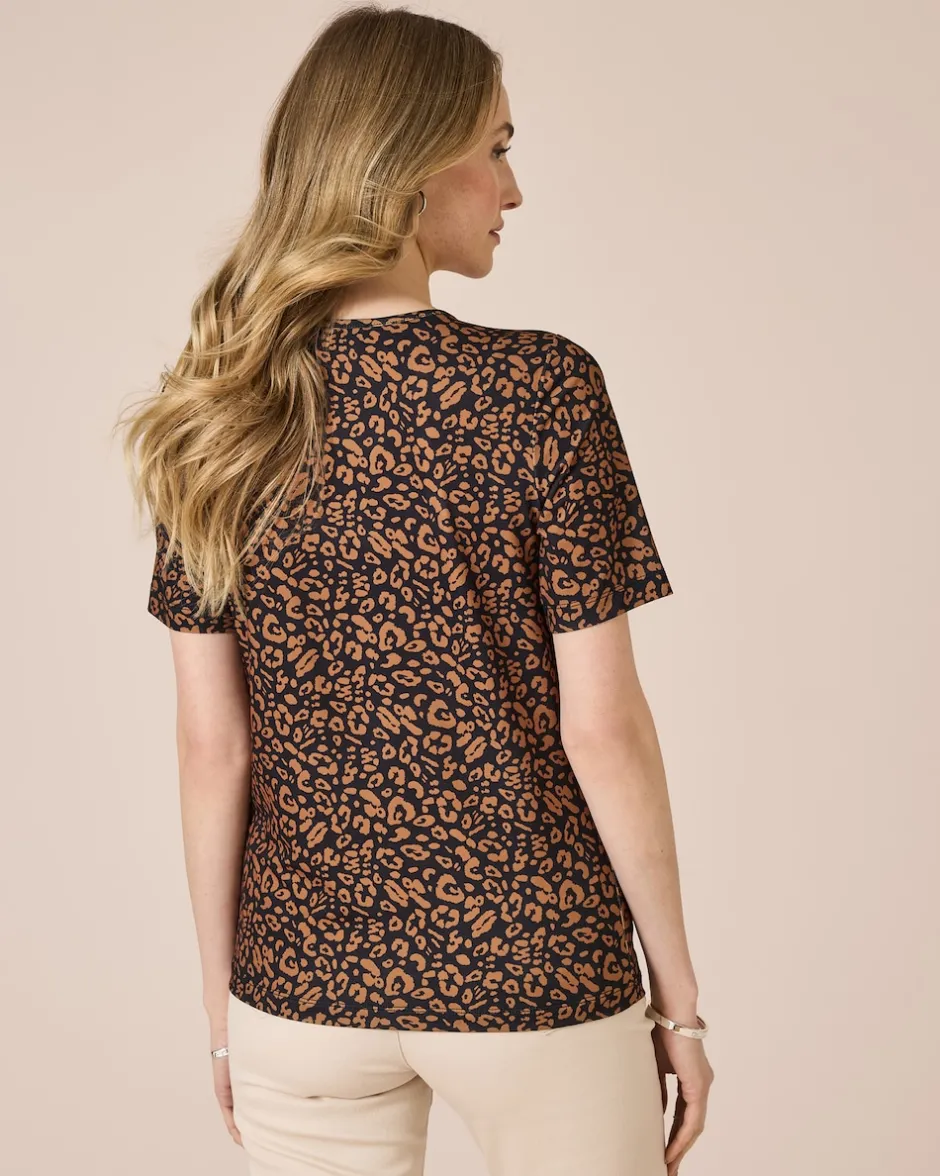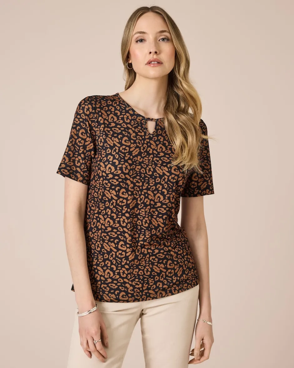 Mit seinem femininen Schnitt und der feinen Materialqualität lässt sich dieses Shirt auch zu eleganten Hosen toll tragen. Das beliebte Leo-Design ist in verschiedenen angesagten Farben erhältlich und passt damit perfekt in die aktuelle Saison. Für einen hübschen Blickfang sorgt das kleine Cut-Out unter dem Ausschnitt. Freuen Sie sich auf einen vielseitigen Kombipartner für modische Sommer-Outfits.