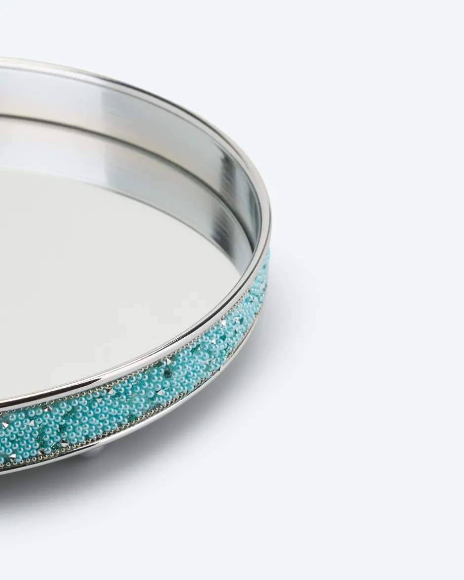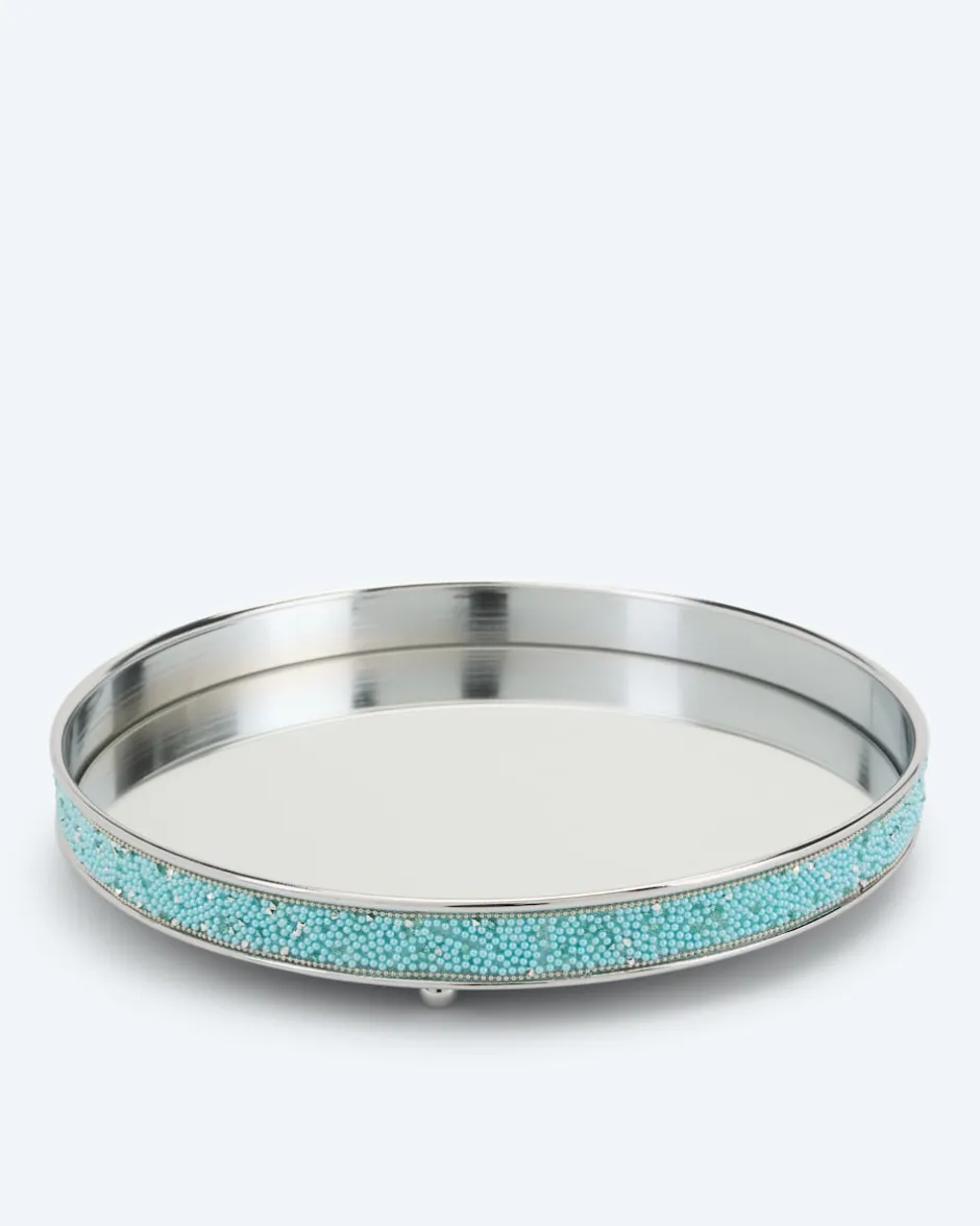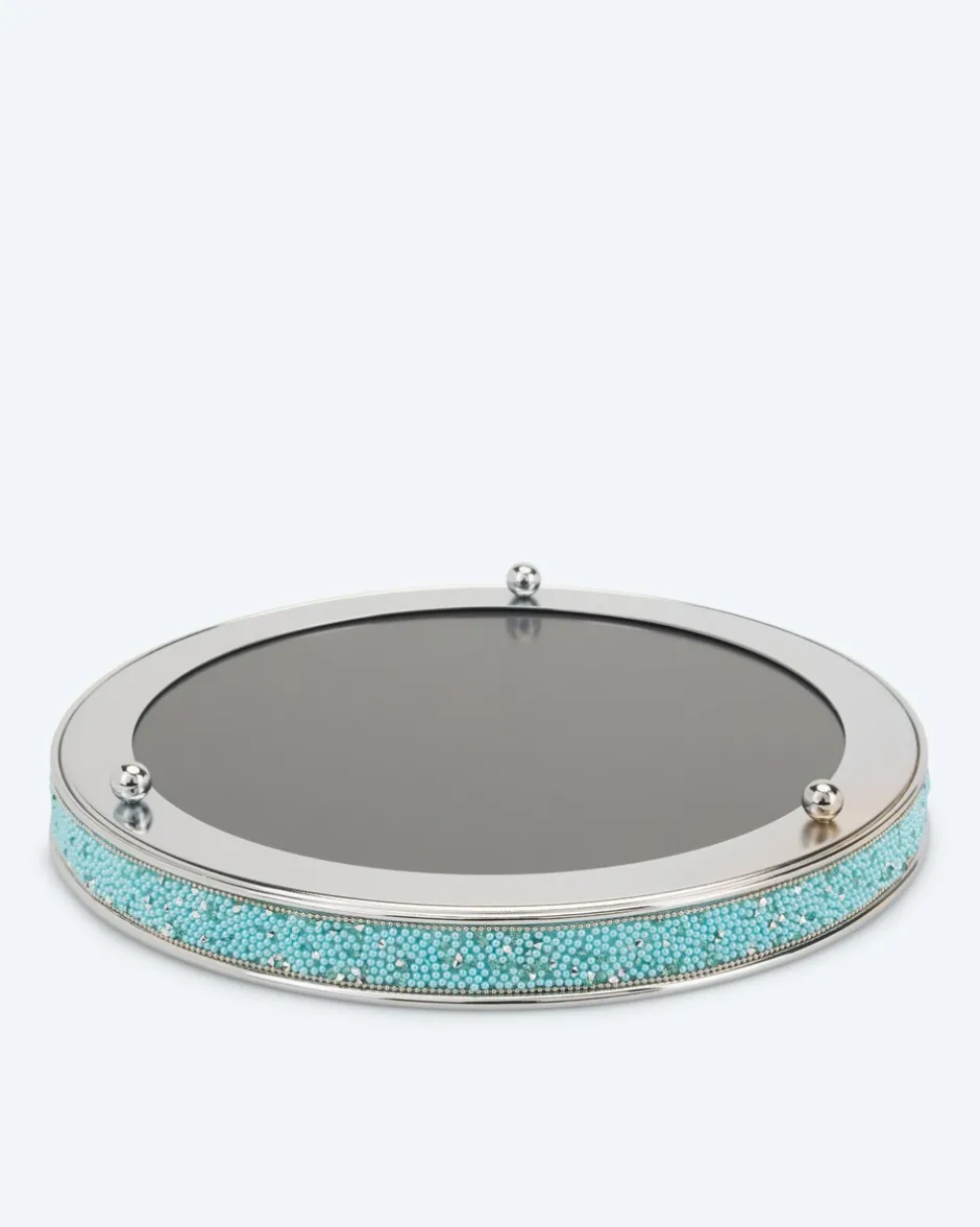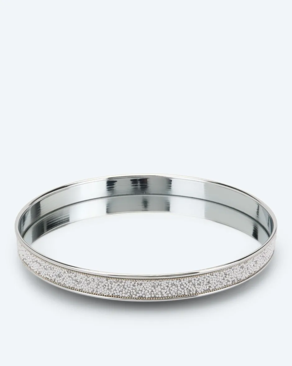 Auf der Suche nach einem neuen Deko-Accessoire? Das elegante Tablett in runder Form eignet sich ideal, um köstliche Früchte, selbstgebackene Kekse oder edle LED-Kerzen zu präsentieren. Während der Rand außen mit künstlichen Perlen verziert ist, ist die Fläche in Spiegel-Optik designt. Das Tablett ist vielseitig einsetzbar, jedoch nicht für offene Lebensmittel geeignet.