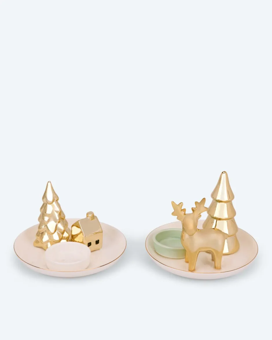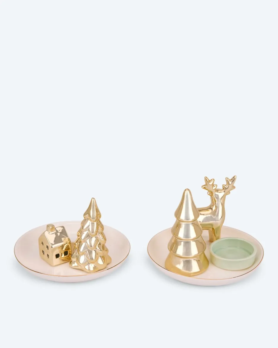 Diese eleganten Teelichthalter könnten das Highlight Ihrer Weihnachtsdekoration werden. Die beiden Objekte sind aus hochwertiger Keramik gefertigt und zeigen ein edles Metallic-Finish. Das stilvolle Set „Hirsch & Tanne“ enthält zwei unterschiedliche Motive, die perfekt miteinander harmonieren. Ob zusammen oder separat platziert – dieses Duo macht ein stimmungsvolles Ambiente perfekt. Ideal für eine Tafel, Kommode oder Fensterbank.
