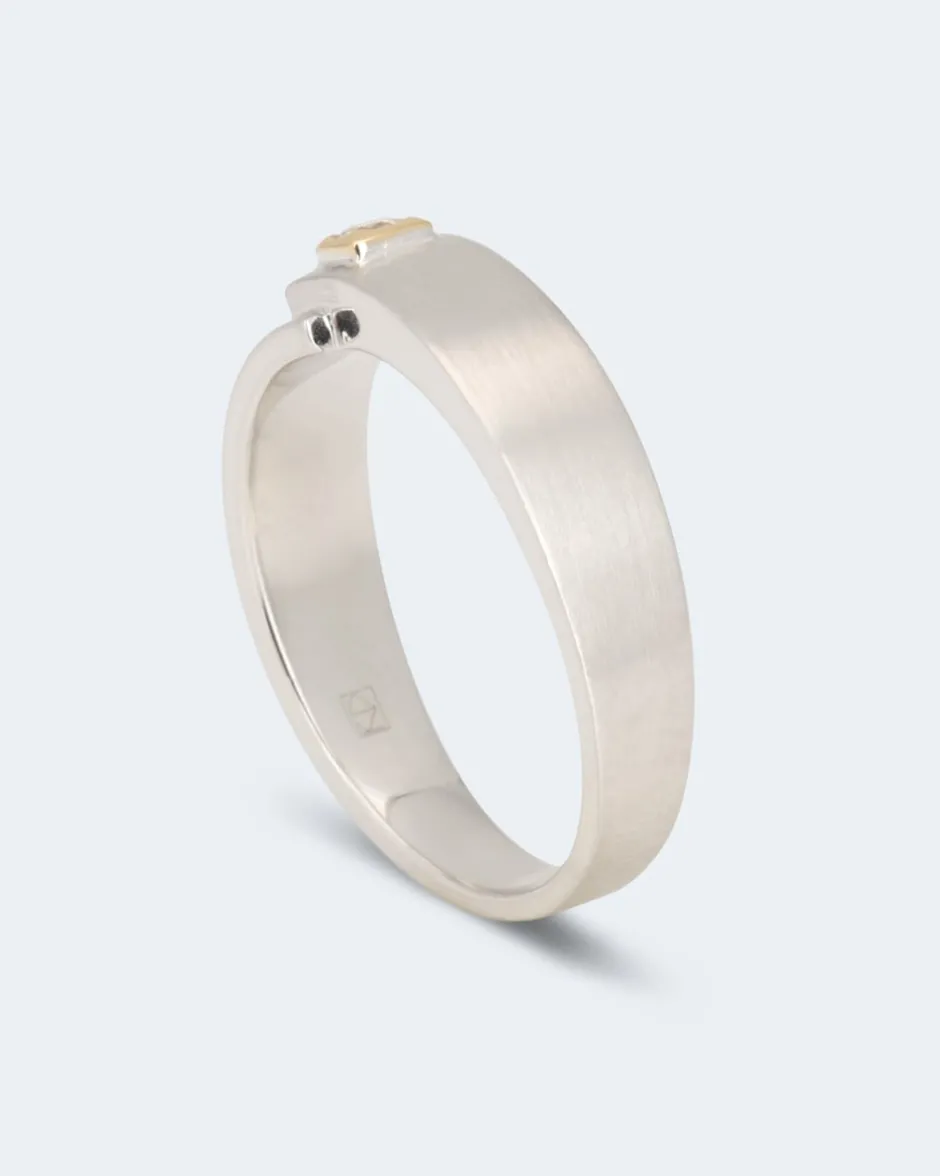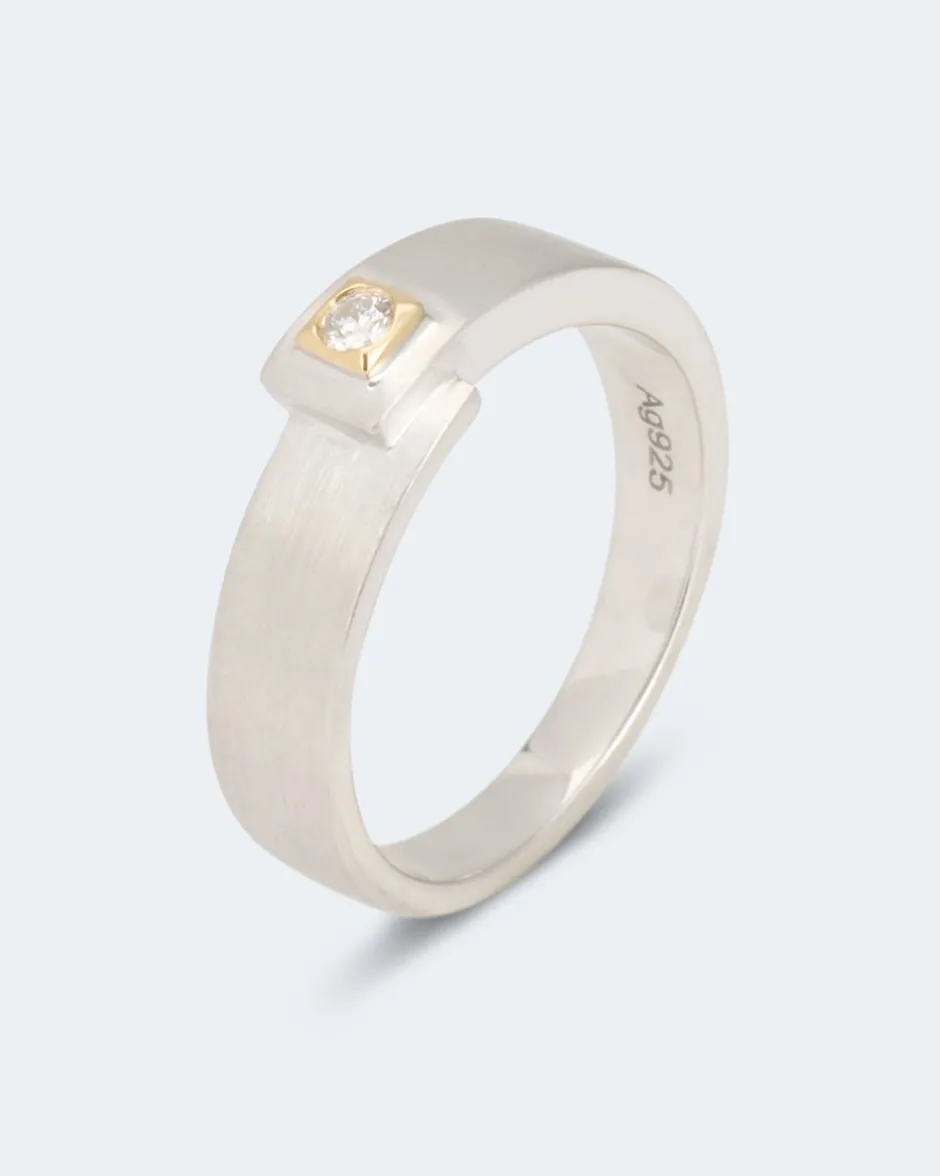 Dieser Diajeune Ring besticht mit einer modisch breiten Ringschiene, einem raffinierten Design und hochwertigsten Materialien. Die Ringschiene besteht aus mattiertem 925er Sterlingsilber. Auf Höhe des Ringkopfes sind die Ringenden überlappend gearbeitet und mit einem quadratischen Element aus hochglanzpoliertem 585er Gelbgold verziert. Darin wird ein Solitär-Brillant in einer Zargenfassung zum fulminanten Blickfang. Die noble Bicolor-Optik gibt dem Ring eine dynamische Ausstrahlung. Der Brillant verfügt über die Reinheit P1 und ist sehr gut geschliffen. Gönnen Sie sich diese besondere Luxus-Kreation.