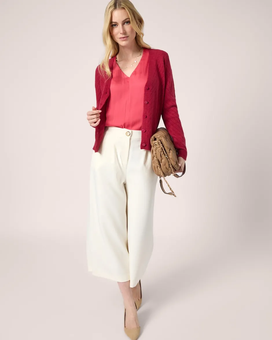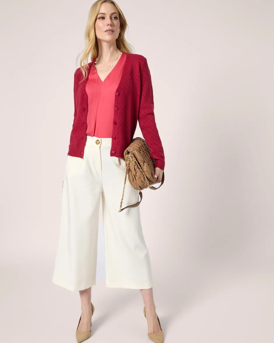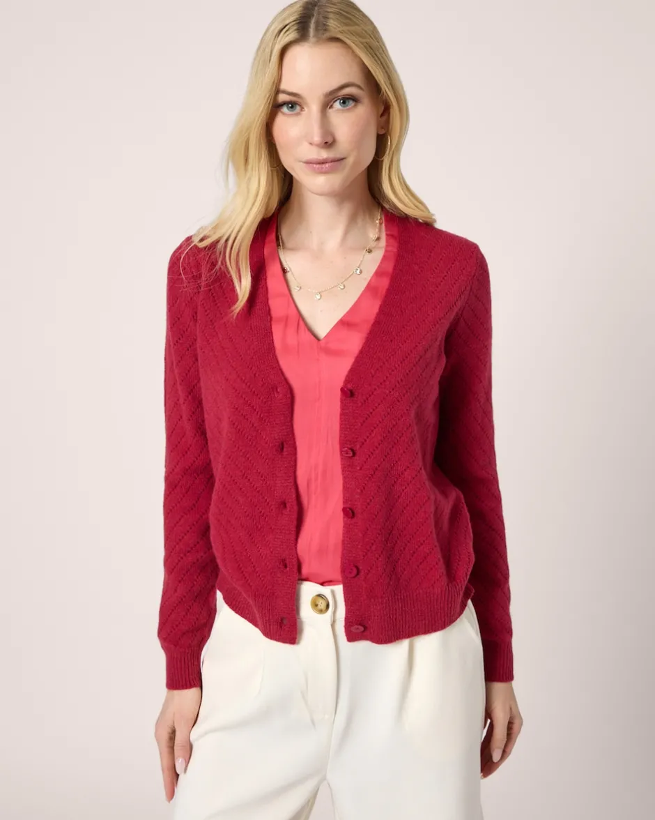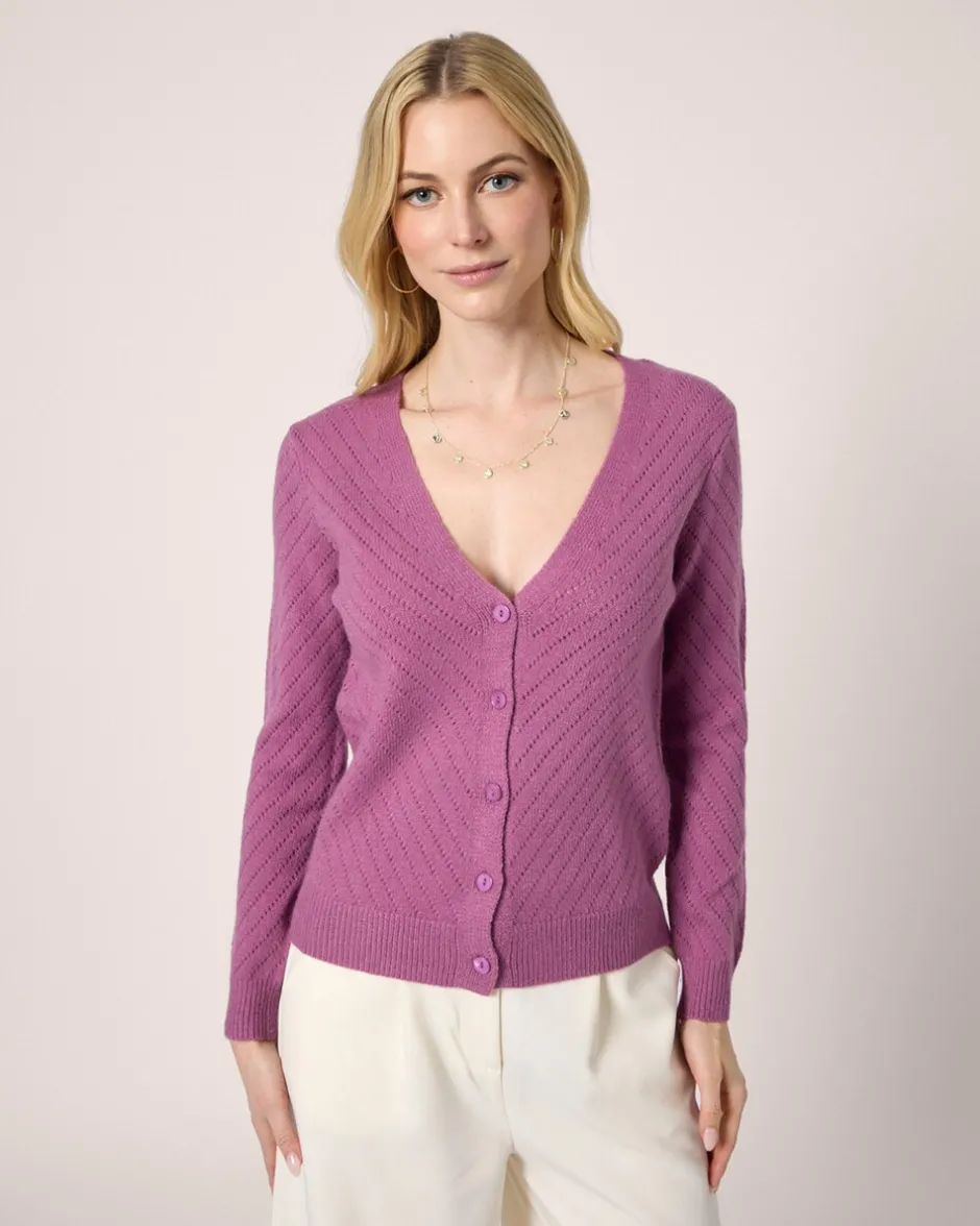Der bezaubernde Cardigan aus dem Kreativ-Atelier von Jana Ina ist allover in einem bezaubernden Loch-Strickmuster in diagonaler Optik gestaltet. Zwei zeitlos gültige Modefarben stehen zur Wahl. Den eleganten Kombi-Look bereichern die lässigen Rippbündchen am Ärmelende und Saum um eine dezent sportive Note. Der Cardigan ist mit einer durchgehenden Knopfleiste ausgestattet, kann aber auch ganz entspannt offen getragen werden.