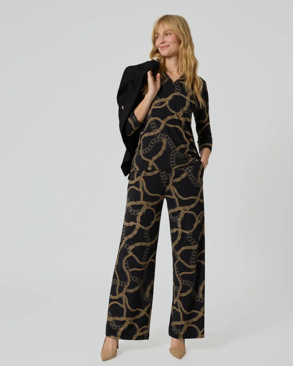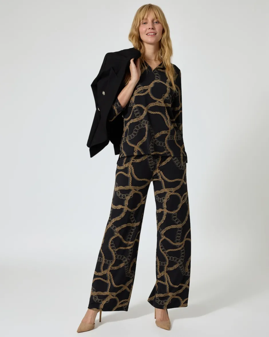 Ein Blusenshirt zum Zungeschnalzen präsentiert Judith Williams mit diesem hinreißenden Fashion-Piece aus ihrer „Woman Deluxe“-Linie. Die Bluse ist allover mit einem goldfarbenen Kettendruck auf schwarzem Hintergrund bedruckt – hinreißend edel und sehr feminin. Ein lässiger Reverskragen mit kleinem V-Schlitz in der Mitte und Ärmel in 3/4-Länge machen den anmutigen Look komplett.
