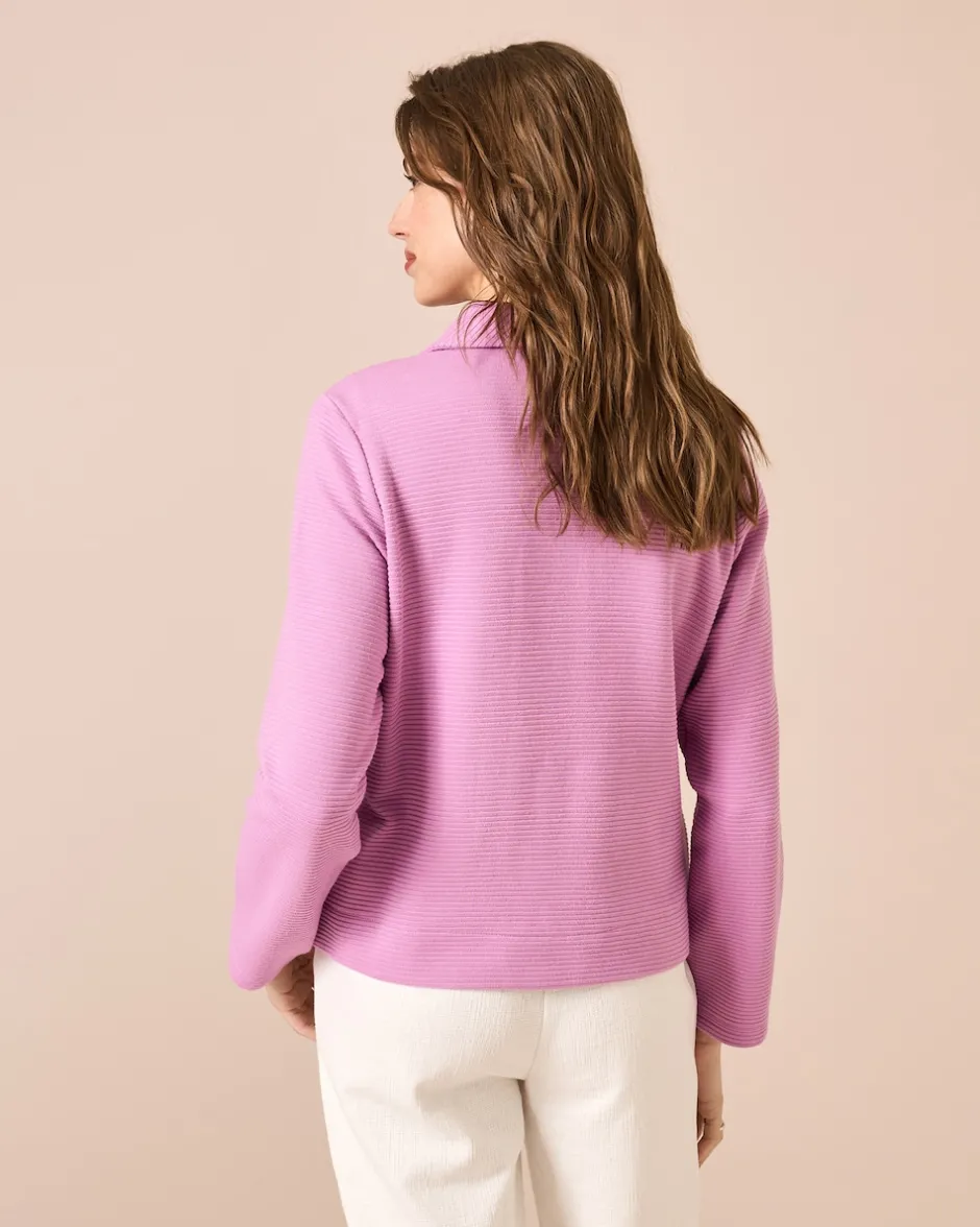 Entdecken Sie neue Stil-Dimensionen mit unserem kombistarken Cardigan im Blazer-Style. Dieses Fashion-Piece im Uni-Design, gefertigt aus Ottoman Jersey in dezenter Querripp-Optik, bietet einen eleganten und zugleich lässigen Look. Der kleine Umlegekragen und die Knopfleiste mit großen Dekoknöpfen verleihen dem Cardigan einen Hauch von klassischem Charme, während die seitlichen Pattentaschen mit Knöpfen einen zusätzlichen Blickfang bieten. Figurformende Nähte und der gerundete Vordersaum sorgen für eine schmeichelhafte Silhouette. Ob zu Jeans und T-Shirt für ein Casual-Outfit oder zu einer eleganten Hose und Bluse für den Business-Look, dieser Cardigan passt immer.