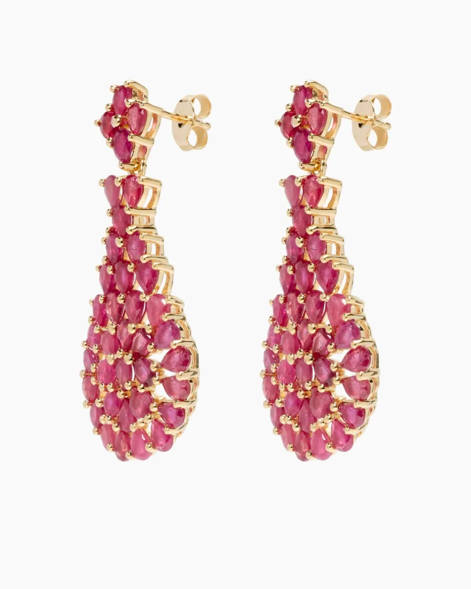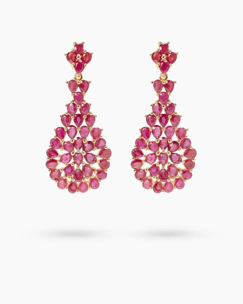 Wenn Sie üppig besetzten Edelsteinschmuck in verspielten Designs lieben, dann dürften diese aufwendig gestalteten Ohrstecker perfekt zu Ihrem Stil passen. Die Ohrstecker sind aus gelbvergoldetem Silber 925, das dank der Hochglanzpolitur herrlich schimmert. Besetzt mit je 37 Sambia Rubinen in Tropfenform, die dank des Facettenschliffs feurig rot schillern. Die Rubine sind in Krappen gefasst und bringen ca. 18,5 ct auf die Edelsteinwaage. Ein elegantes Accessoire, das einen bezaubernden Rahmen für Ihr Gesicht bildet.