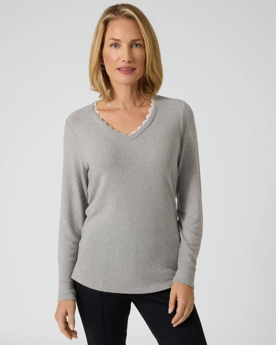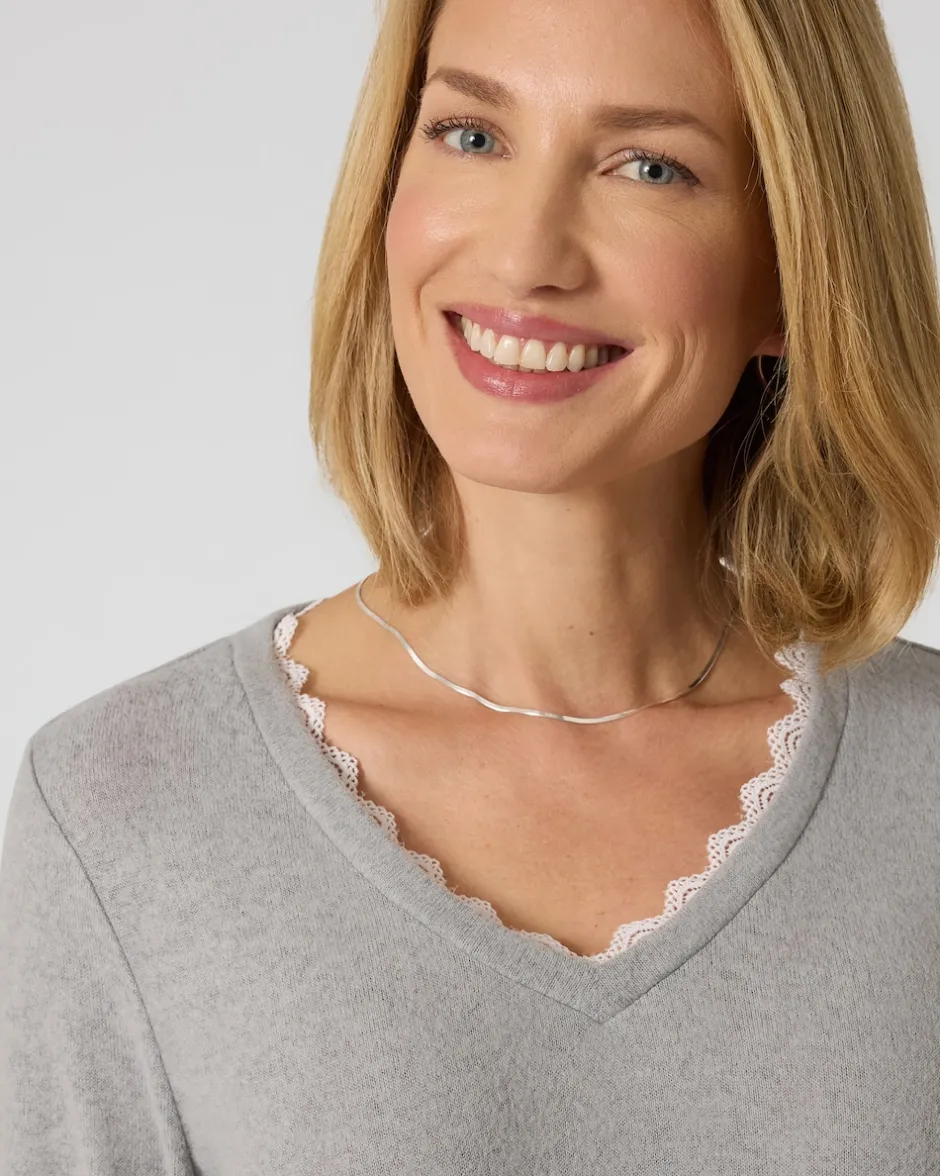 Was gibt es Schöneres als an kalten Tagen in einen warmen und weichen Pullover zu schlüpfen? Dieses kombistarke Modell von Rita Pfeffinger ist dafür perfekt geeignet. Es hat einen femininen V-Ausschnitt, der mit einem romantischen Spitzeneinsatz verziert ist. Der einfarbige Pullover ist tailliert geschnitten, wobei der flache Saum an beiden Seiten angenehm geschlitzt ist. So bietet er der Trägerin ausreichend Bewegungsfreiheit. Der leicht elastische Material-Mix mit hohem Viskose-Anteil liegt „kuschelweich“ auf der Haut.