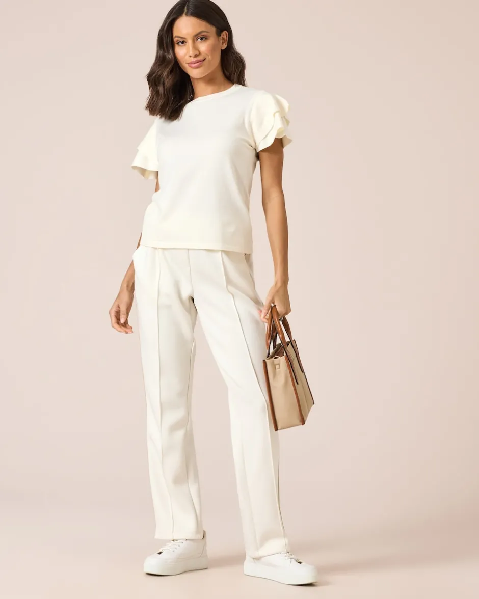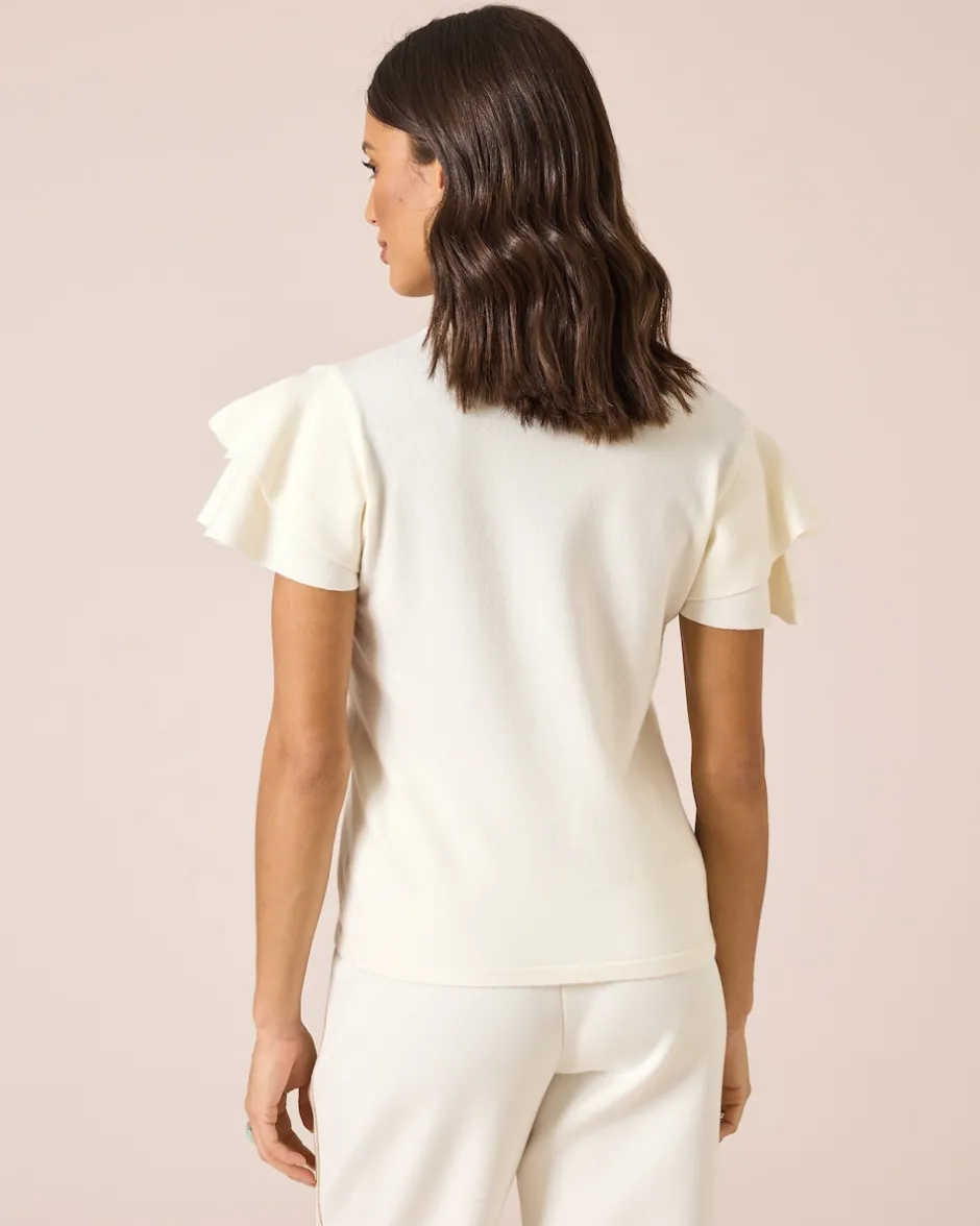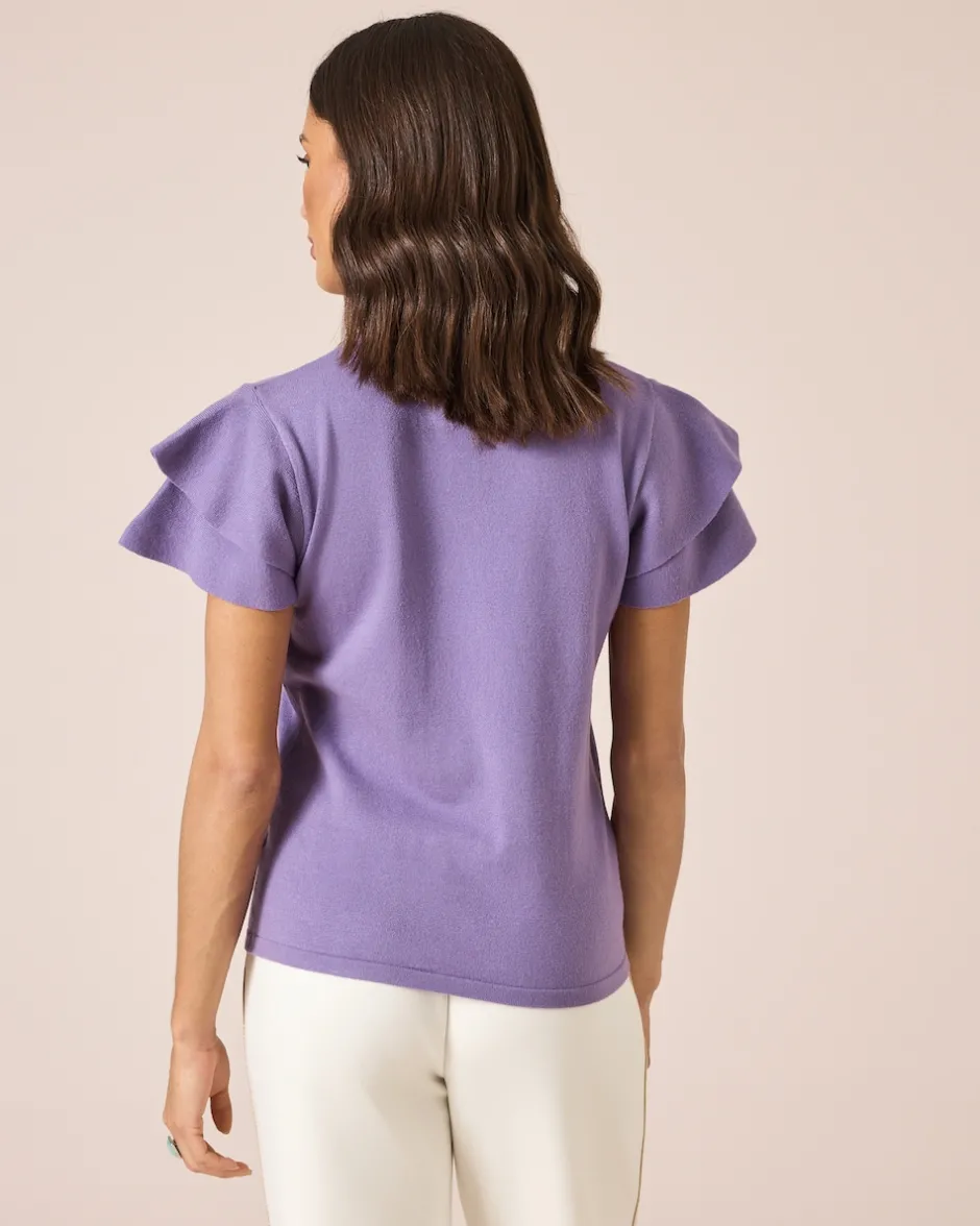Das schlicht-elegante Unidesign in Violett oder Creme macht diesen Pullover zu einem echten Kombitalent, das perfekt zu vielen Teilen aus Ihrem Kleiderschrank passen wird. Eine kräftige Prise Romantik erhält der Pulli durch die ausgestellten Volantärmel. Der taillierte Schnitt und die feinelastische Strickqualität mit hohem Viskoseanteil sichern eine schlanke und feminine Silhouette sowie jederzeit besten Tragekomfort.
