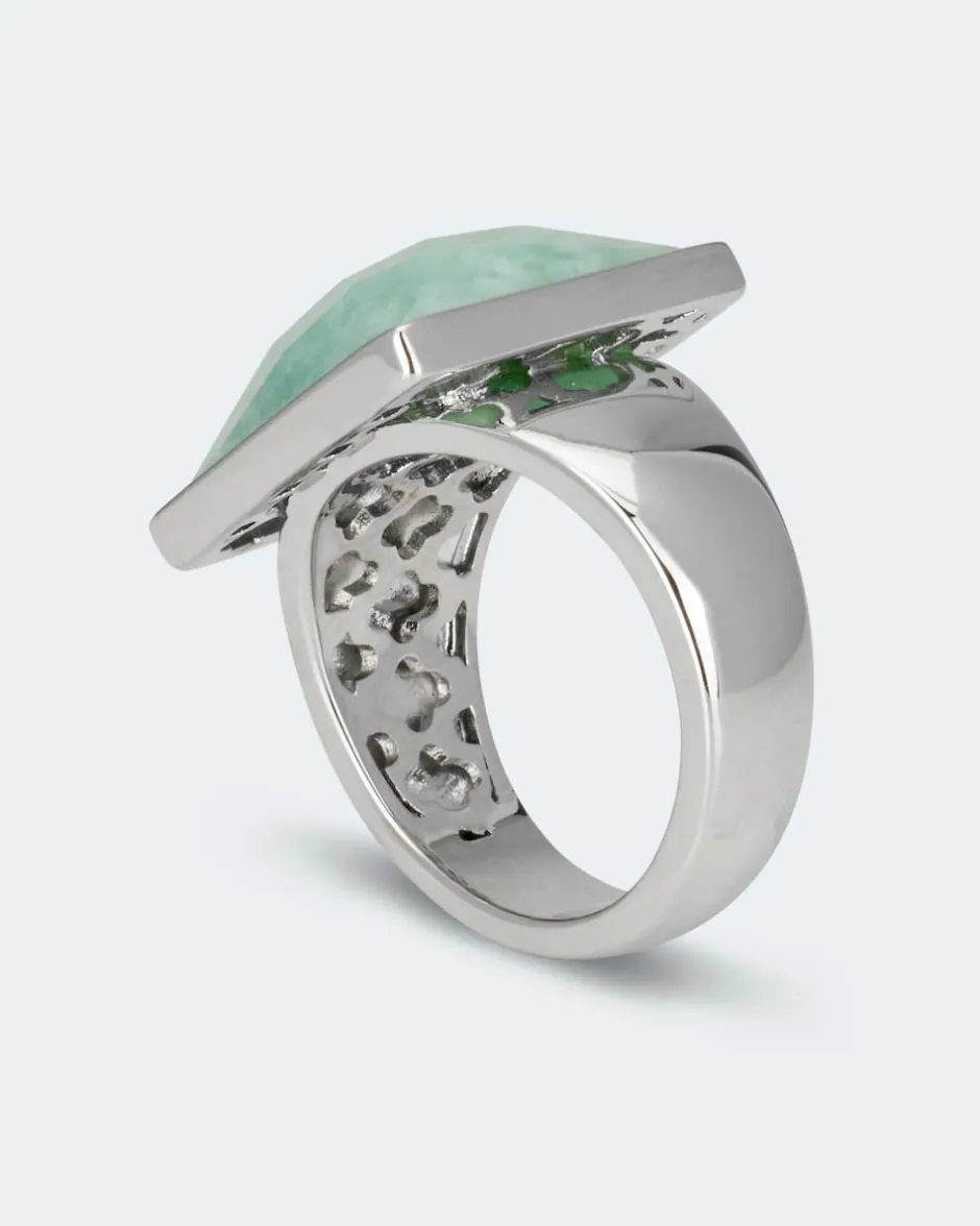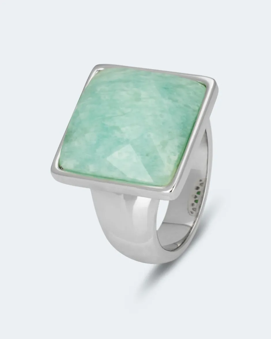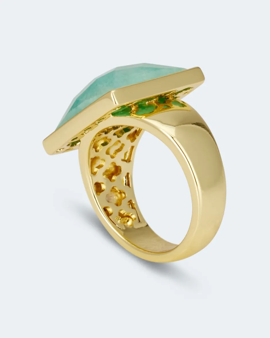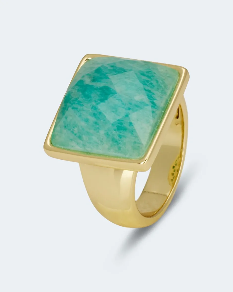 Der quadratische Edelstein in spannendem Grün wird durch seine schillernden Schachbrettfacetten zum faszinierenden Blickfang an Ihrem Finger. Der große, kantige Amazonit dominiert mit seiner Präsenz den Ringkopf und ist wahlweise im Gelb- oder Weißgold-Look erhältlich. Stecken Sie sich dieses Kleinod von Jana Ina Jewellery an den Finger und machen Sie damit Ihre Freizeit-Outfits komplett. Trauen Sie sich und bekennen Sie Farbe.