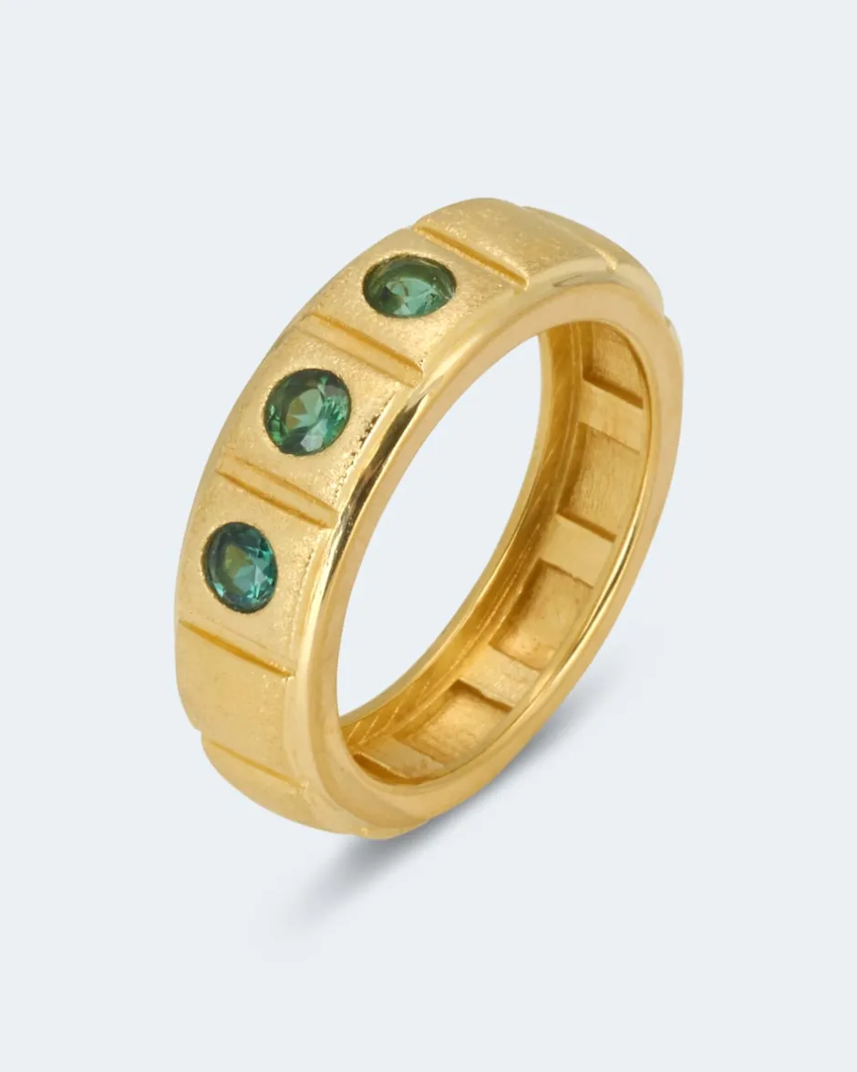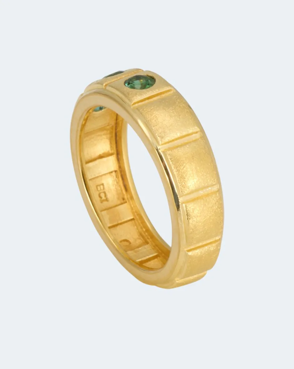 Der Bandring zieht jeden Betrachter in seinen Bann. Auf der etwas breiteren Ringschiene sind drei runde Turmaline gefasst, die dank des Facettenschliffs in allen Grünschattierungen glitzern. Die grünen Edelsteine sitzen in Zargenfassungen und verschmelzen nahezu mit der Ringschiene. Der Ring selber besteht aus einer „Touch of Gold“-Legierung mit 4,16 % Feingoldanteil. Die Obreflächen sind außerdem hochglanzpoliert bzw. mattiert. Mit diesem Ring in frechem Grün wird jeder Look zu etwas ganz Besonderem.