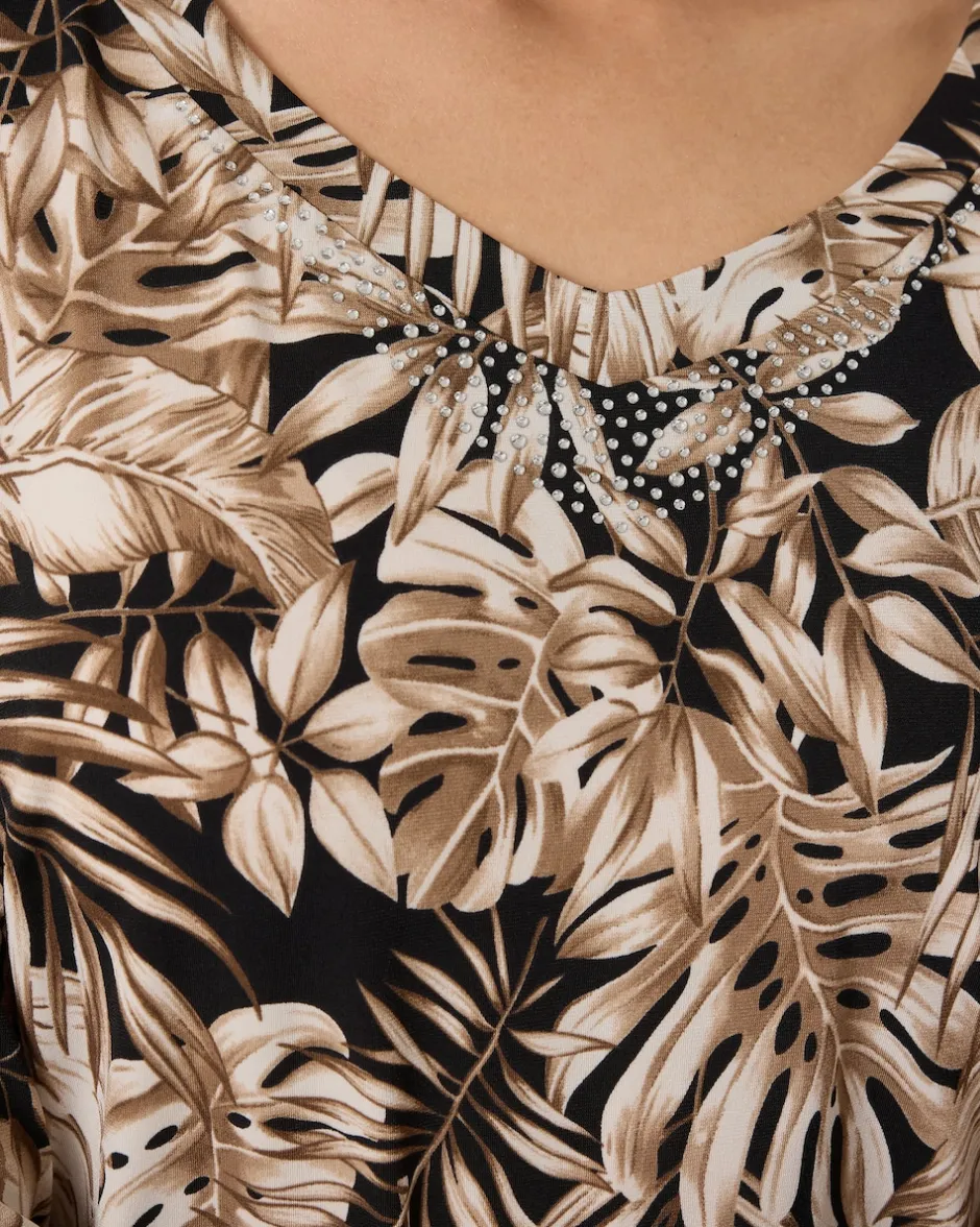 Das hinreißende Shirt gefällt durch seinen mehrfarbigen Allover-Print mit einem anmutig gestalteten Blättermuster. Dabei stehen zwei modische Farbvarianten zur Wahl. Am Halsausschnitt jeweils mit glitzernden weißen Strass-Steinchen verziert. Das Shirt ist körpernah und etwas länger geschnitten, so formt es eine schöne feminine Silhouette. Perfekt etwa zu Ihrer schwarzen Lieblings-Jeans. Pumps oder Sneakers dazu – und schon sind Sie top angezogen für Job ober Freizeit.