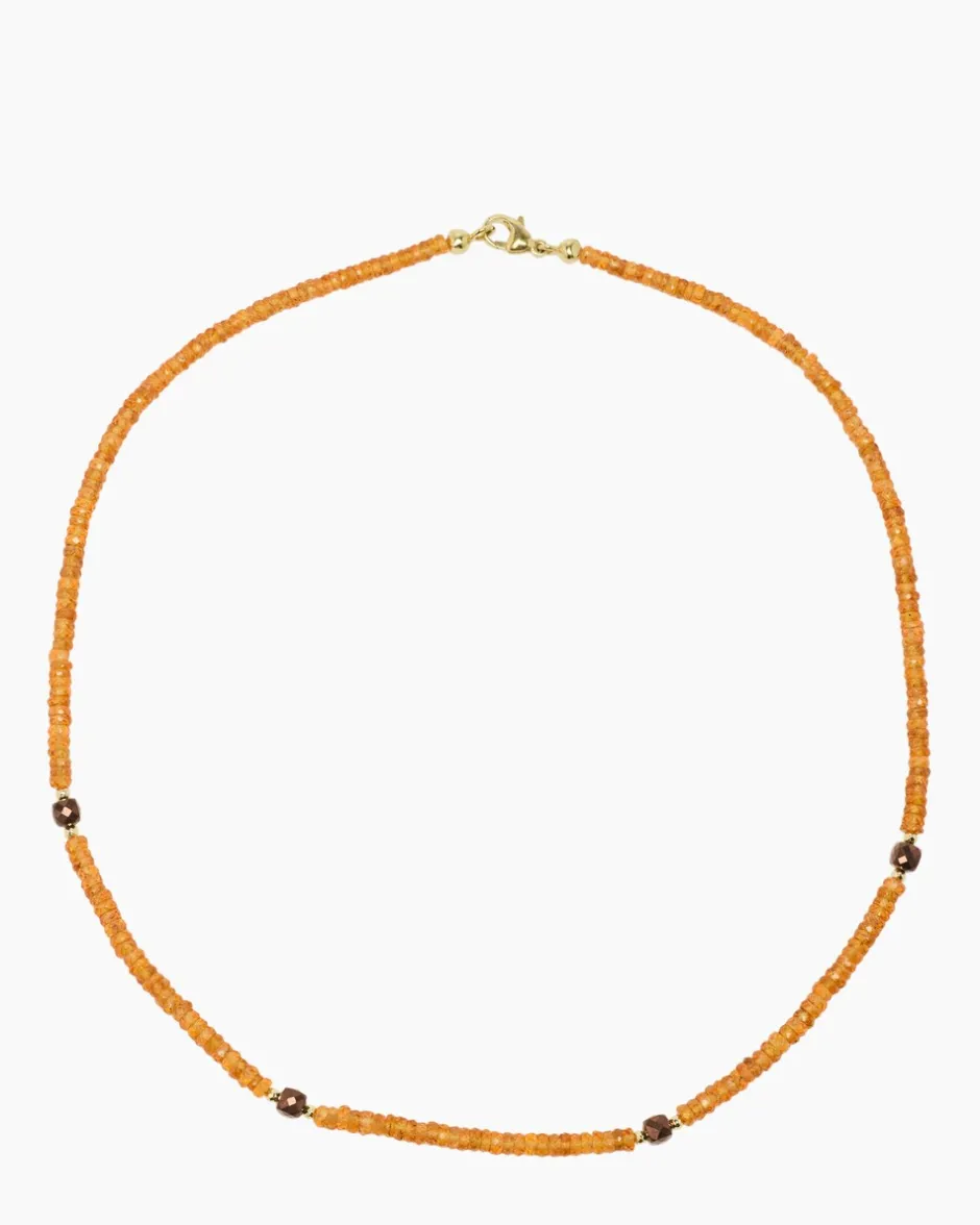 Das Collier besteht aus orangefarbenen Mandarin-Granat-Edelsteinen und braun-goldfarbenen Häamtiten. Die Mandarin-Granat-Edelsteine sind rondelleförmig und facettiert, die Hämatite sitzen als Akzent kugel- und würfelförmig dazwischen. Das hinreißende Funkeln der strahlend schönen Mandarin-Granate zieht jeden Betrachter in seinen Bann. Das zeitlos schöne Design, der exquisite Schliff und der farbschöne Glanz der Edelsteine verführt immer wieder zum Betrachten, Träumen und Schwelgen.