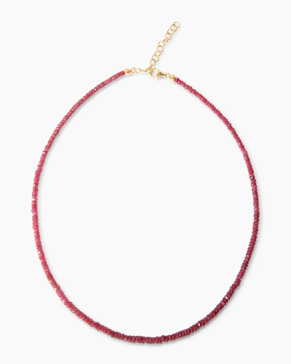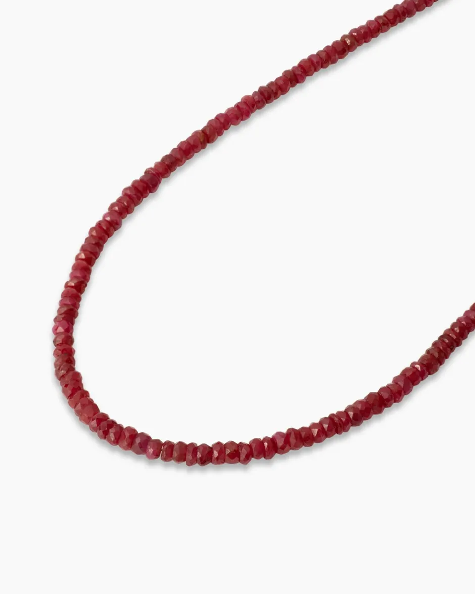 Das Collier ist ganz aus roten Rubin-Rondellen gearbeitet. Die Rubine sind facettiert und funkeln und strahlen in allen Rotnuancen. Das Collier hat die perfekte Länge von 45 cm und macht Ihr Dekolleté zum unwiderstehlichen Blickfang. Das zeitlos schöne Design, der exquisite Schliff und der farbschöne Glanz der Rubine verführt immer wieder zum Betrachten, Träumen und Schwelgen.
