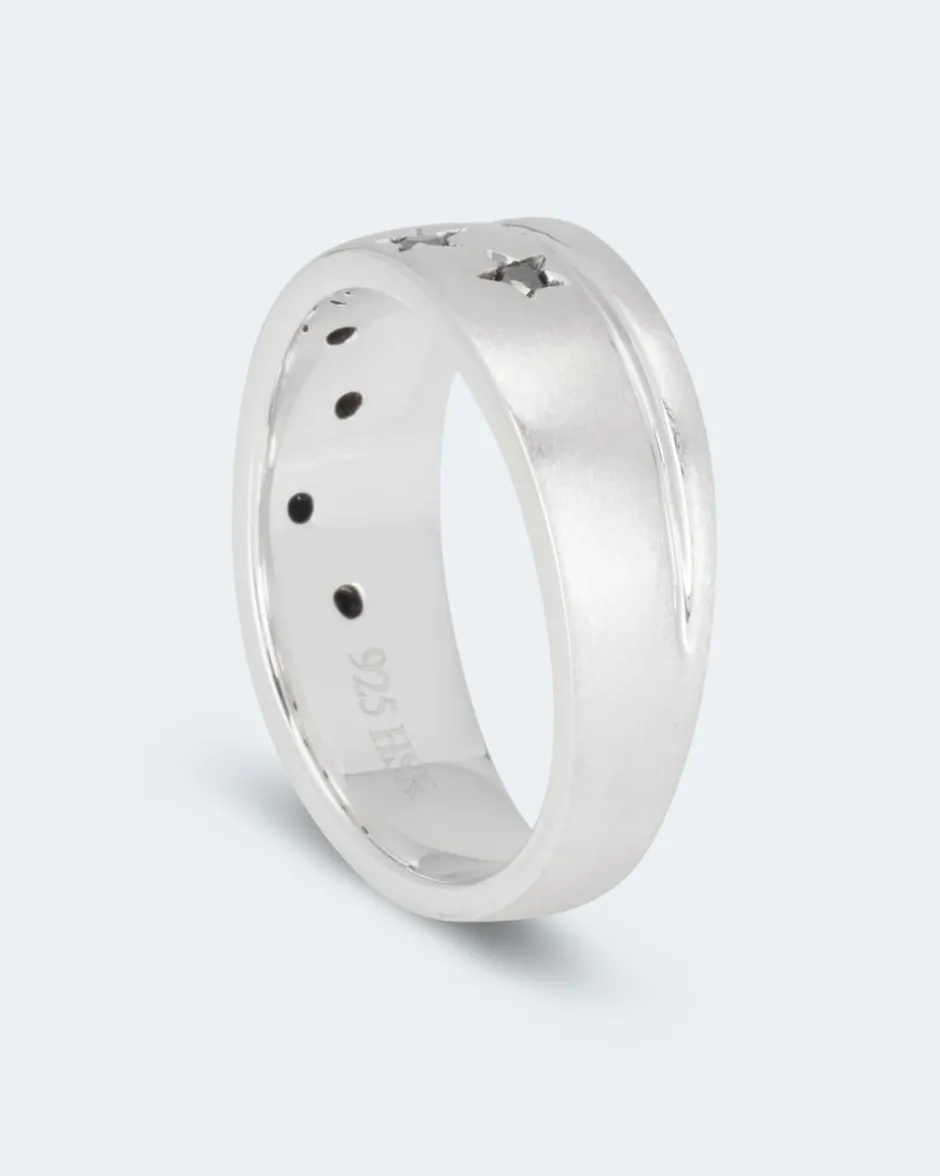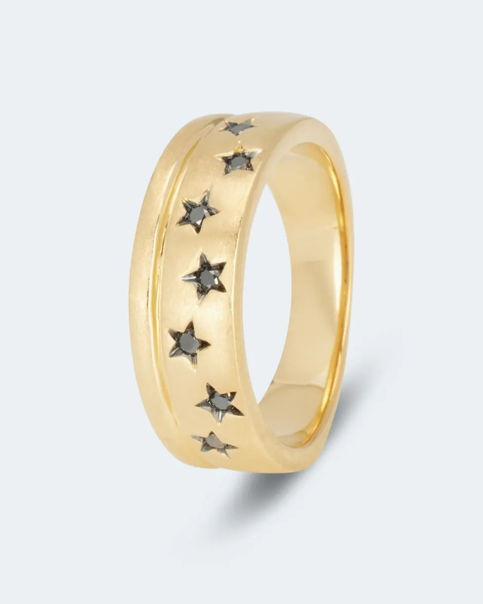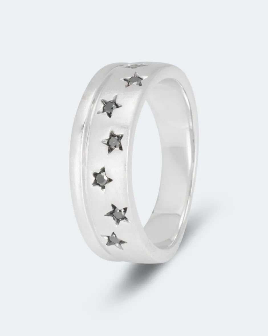 Sieben funkelnde Brillantsterne leuchten Ihnen auf diesem Ring entgegen. Der Ring aus Silber 925 ist in zwei Varianten erhältlich. Gelbgoldplattiert oder rhodiniert in Silberweiß. Die schwarzen Brillanten sind im Brillantschliff veredelt und von guter Schliffqualität. Die Brillanten sind eingerieben und gleichmäßig über die Ringschiene verteilt. Eine Optik, die jeden Betrachter sofort in den Bann zieht und jedes Outfit edel abrundet. Alleine oder zusammen mit Ihren anderen Ringen getragen – dieser Ring wird Ihnen lange Freude bereiten.