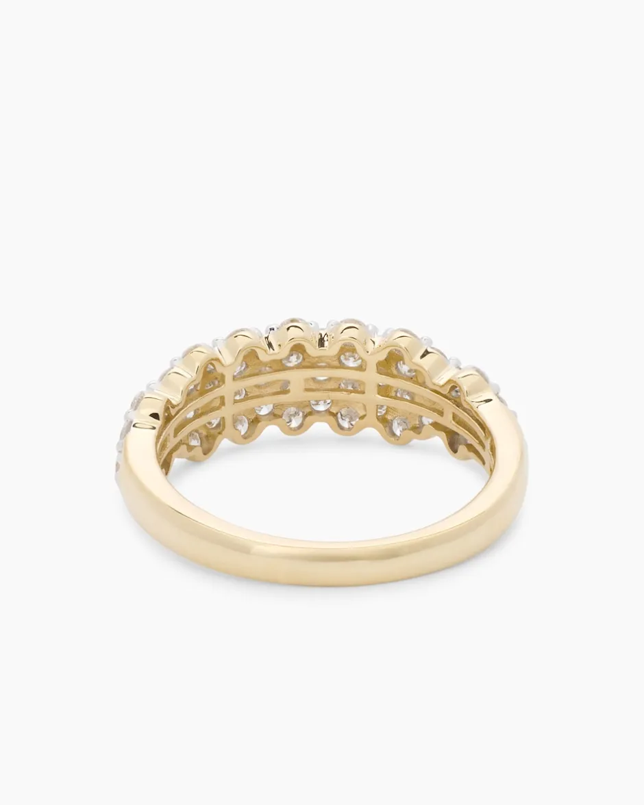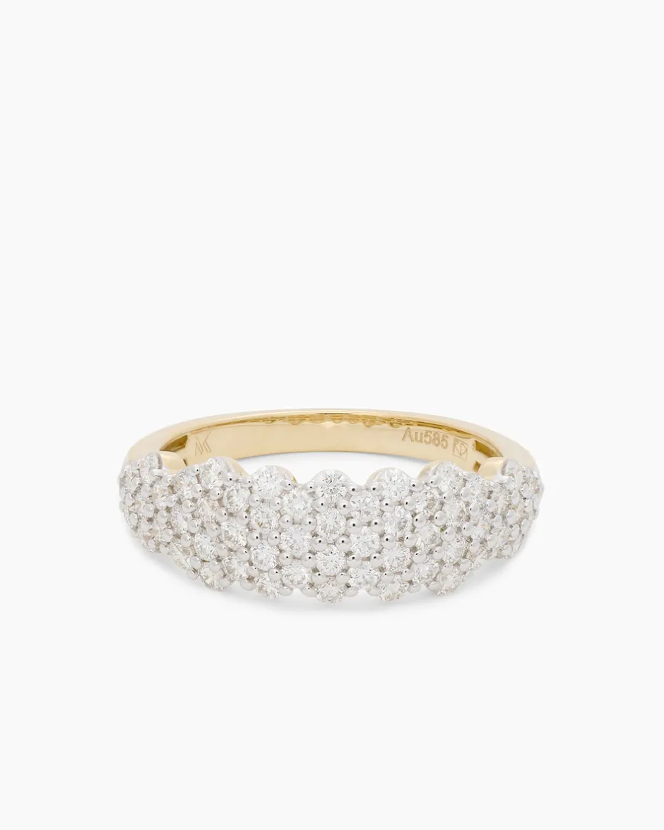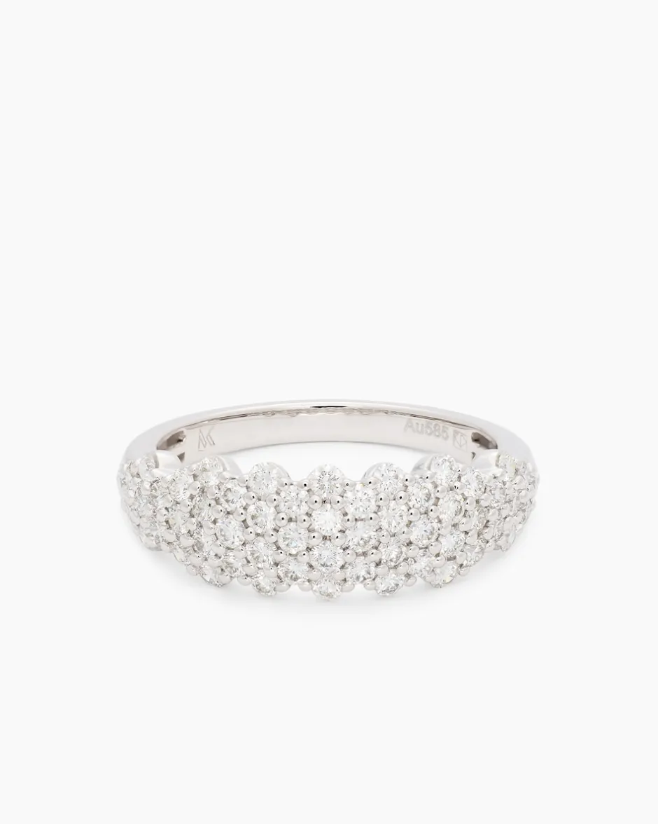 Hier kommt ein neues Schmuck-Highlight von Marvin Kulik für Liebhaberinnen von Brillanten. Der luxuriöse Ring ist aus hochglanzpoliertem 585er Gelb- oder Weißgold erhältlich. Den Ringkopf zieren 54 runde Brillanten in feinem Weiß. Alle Steine sitzen in Krappenfassungen, verfügen über die Reinheit SI1 und über eine sehr gute Schliffqualität. Die Ringschiene ist im Verlauf gearbeitet. Gönnen Sie sich dieses funkelnde Prachtexemplar für Ihre private Schmuckkollektion. Natürlich wird Ihnen der Ring mit Zertifikat in einem stilvollen Etui geliefert.