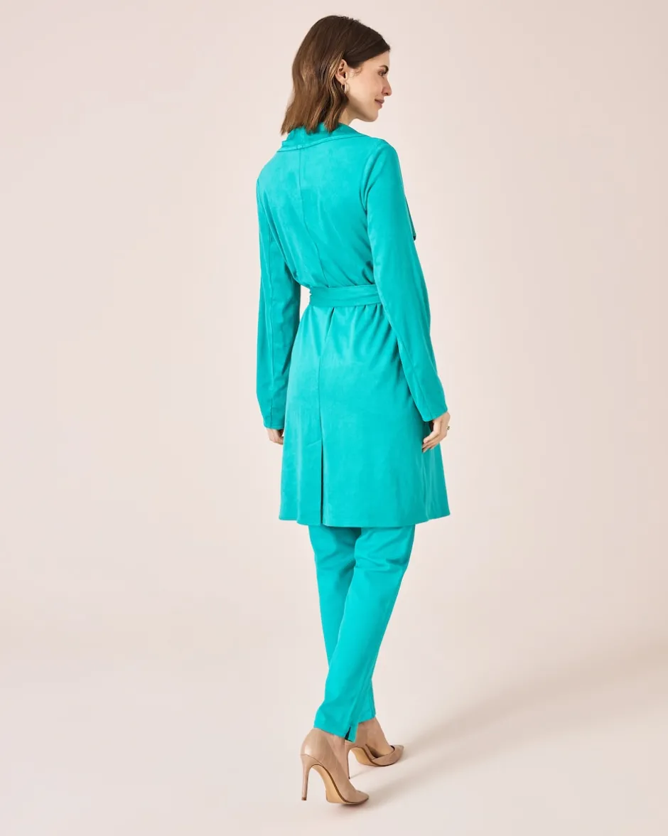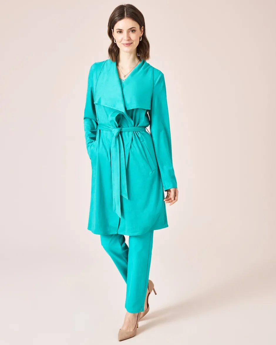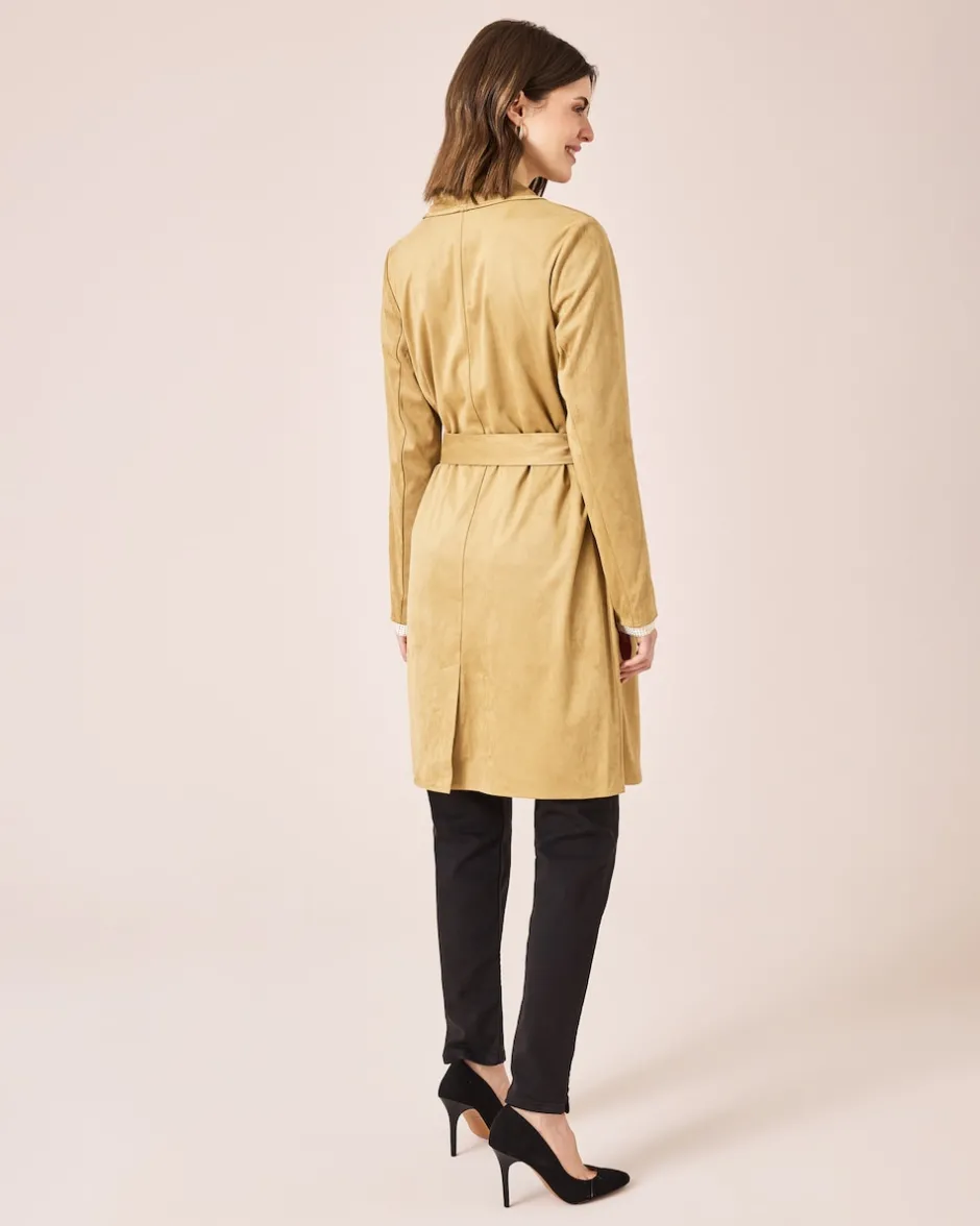 Mit diesem stylishen Mantel in aparter Velours-Optik wird Ihr Outfit komplett. Ein breiter, ausladender Reverskragen verleiht dem Mantel den betont femininen Style, ebenso der taillierende Bindegürtel. Ansonsten besticht der Style durch seine lässige Eleganz mit offener Form, Seitentaschen und Knielänge. Tragen Sie den Look zu eleganten Hosen und Röcken, aber auch zur relaxten Lieblingsjeans.
