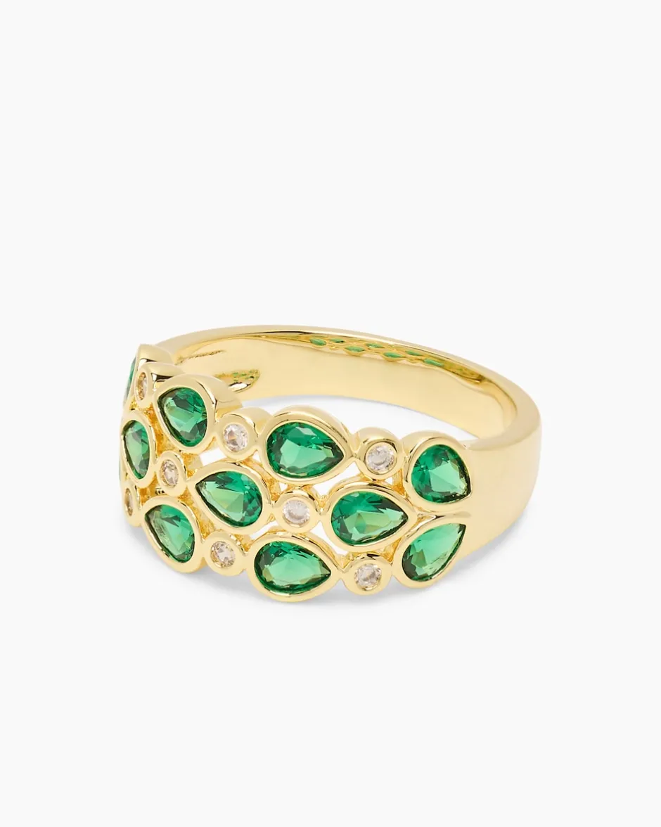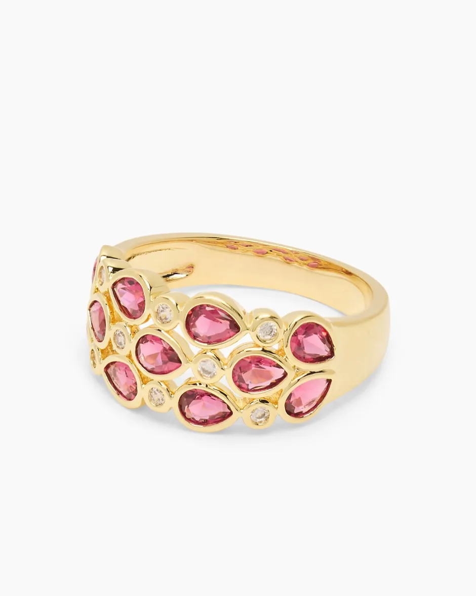 Die farbigen Nanokristalle in aparter Tropfenform sind in drei leicht versetzten Reihen auf dem Ringkopf eingefasst. Dazwischen tummeln sich die kleinen weißen Nanokristallen in runder Form. Alle Deko-Kristalle sind sorgfältig facettiert, so startet ein hinreißendes Funkeln bei jedem Lichteinfall.