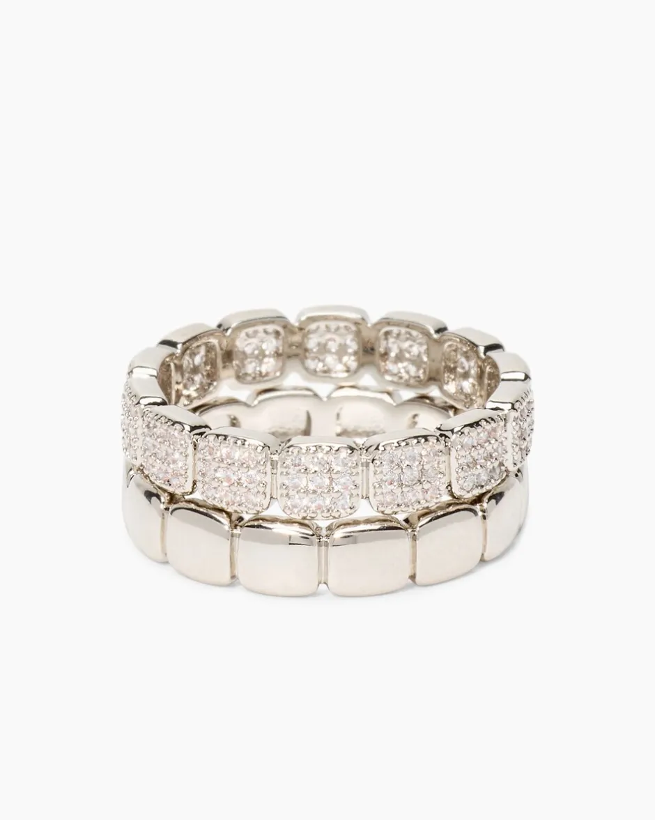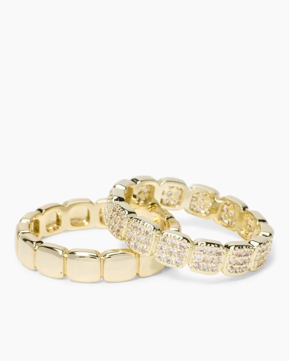 Ob zusammen oder getrennt: Diese beiden Ringe werden Sie bestimmt oft tragen. Das attraktive 2er-Set enthält einen klassischen Ring und einen Glitzer-Ring mit insgesamt 126 funkelnden, weiß strahlenden Zirkonia-Steinen. Davon abgesehen ist das Grund-Design der Ringe identisch. Je nach Geschmack kann der hübsche Schmuck wahlweise mit gelbvergoldetem oder palladiniertem Finish bestellt werden.