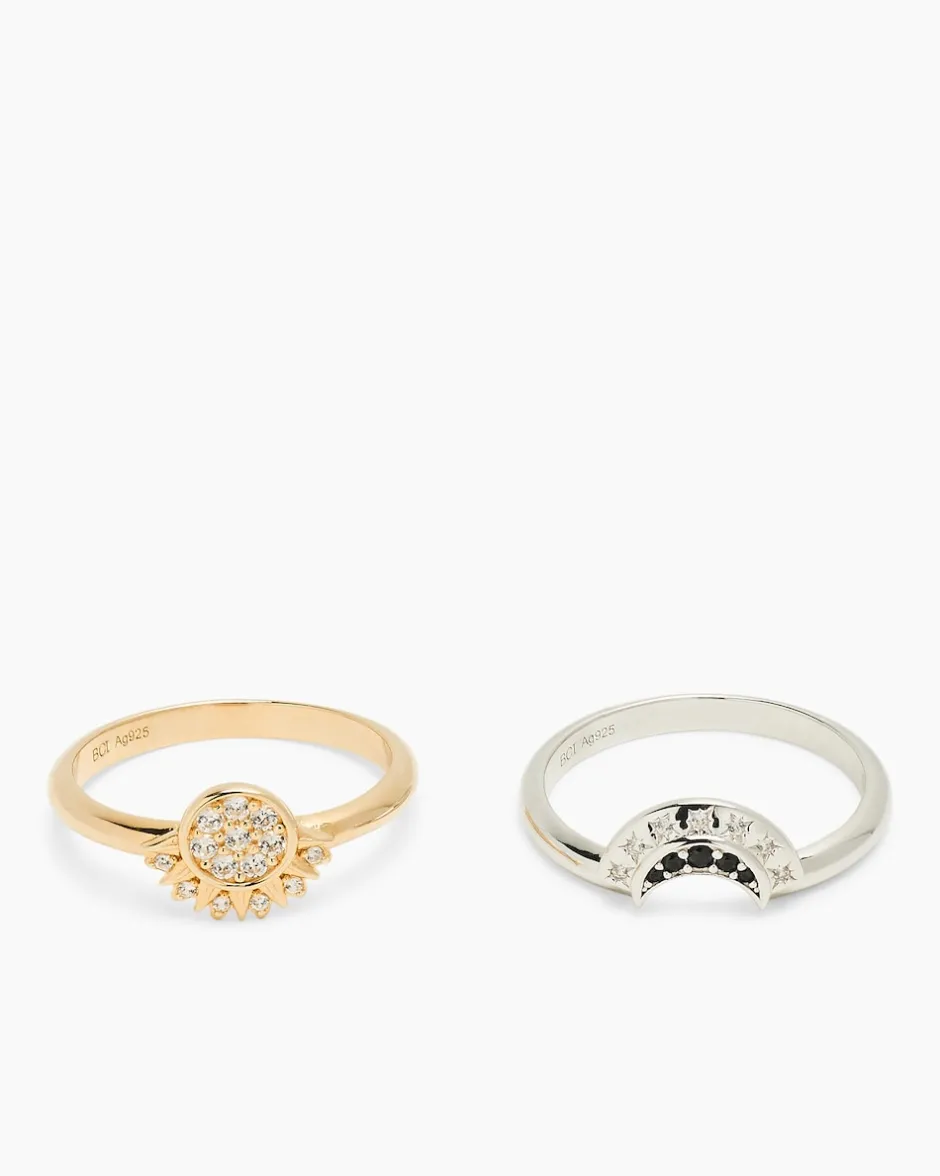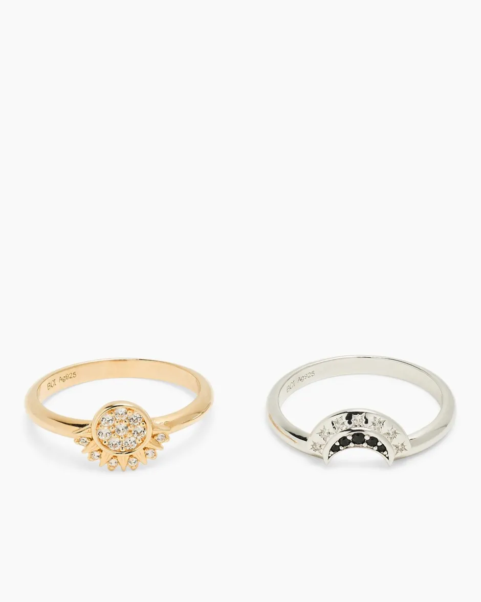 Dieses hübsche Ring-Set von Sogni d’oro enthält einen Ring mit warm glänzendem Gelbgold-Finish und einen im kühl eleganten Weißgold-Look. Die beiden Ringe sind optisch perfekt aufeinander abgestimmt und lassen sich wunderbar mit weiterem Schmuck kombinieren. Der glitzernde Edelsteinbesatz besteht aus 21 weißen Zirkonen und fünf schwarzen Spinellen, jeweils in runder Form und sorgfältig facettiert. Als Grundmaterial diente hochwertiges 925er Sterlingsilber.