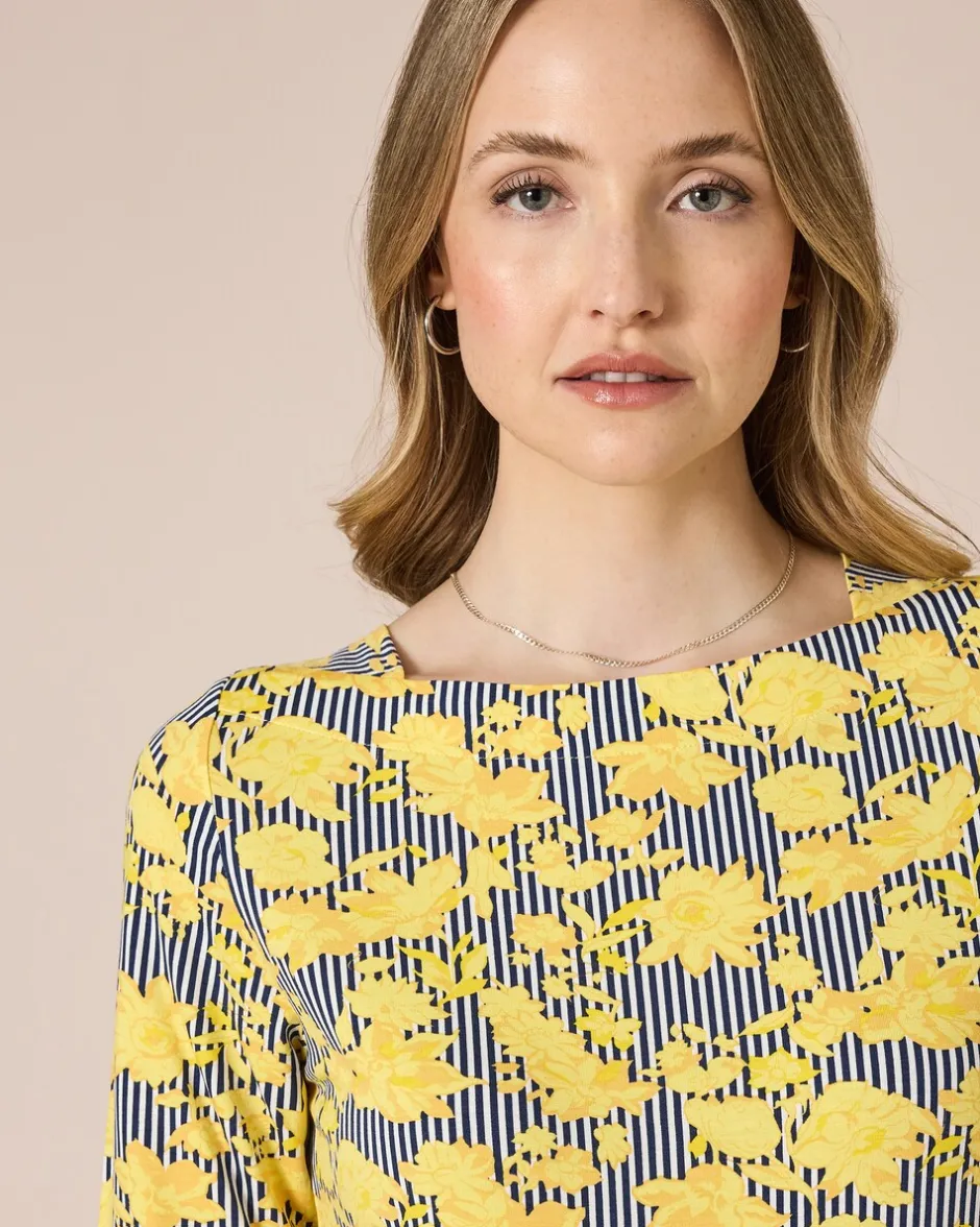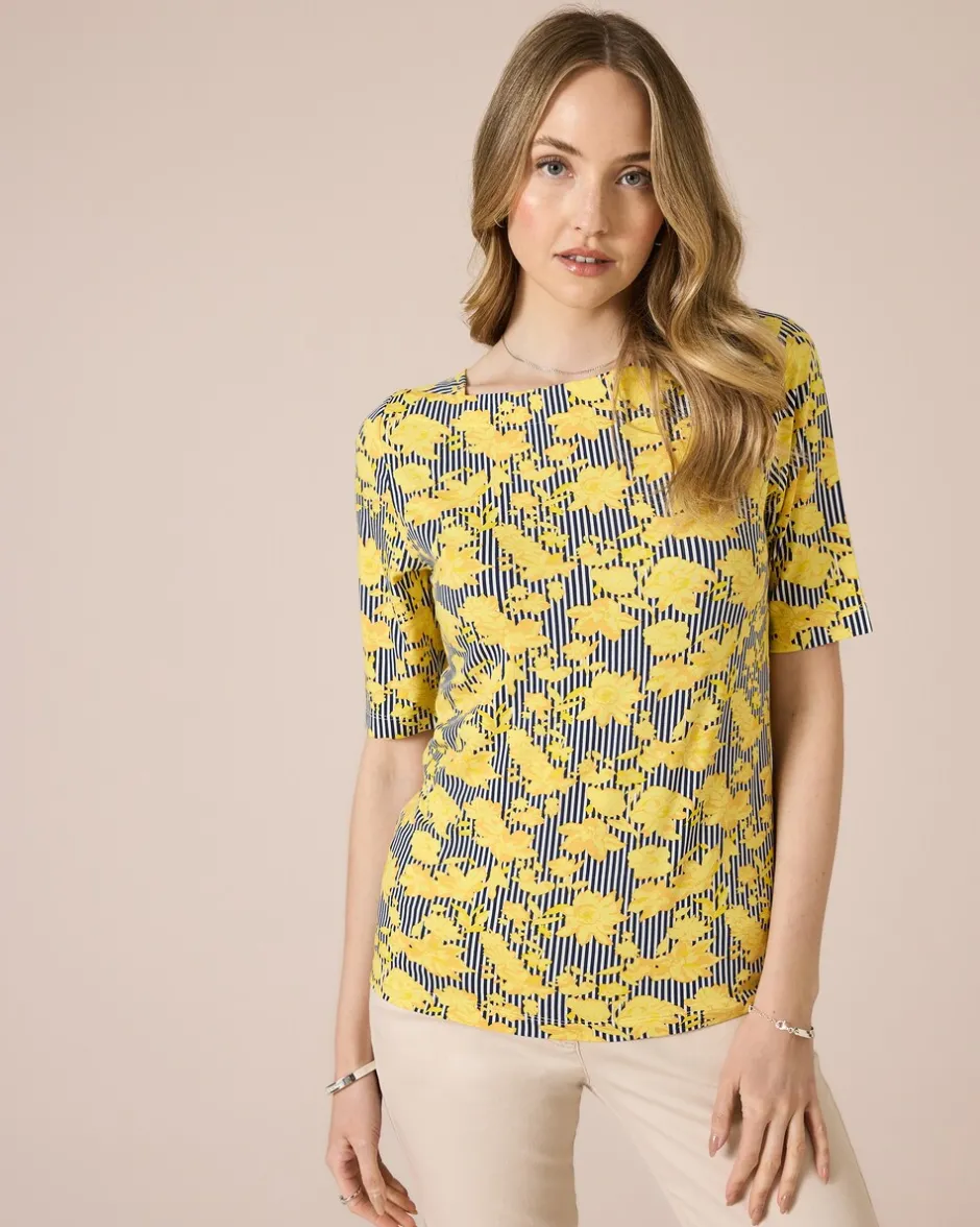 Ein wirklich außergewöhnliches Motiv macht dieses Shirt zu einem Must-have für alle Fashionistas mit einem Faible für stylische Looks. Der Mustermix setzt sich aus vielen platzierten Blumen-Elementen und Längsstreifen zusammen. Erhältlich ist das Shirt in drei trendigen Farbvarianten. Freuen Sie sich außerdem auf besten Tragekomfort und optimalen Sitz auf Ihren Kurven. Zum extravaganten Look passt auch die hohe Materialqualität: Das Shirt ist aus Lenzing EcoVero™ Viskose gefertigt, einer nachhaltigen Faser, die gut für die Umwelt ist und so ein rundum gutes Gefühl vermittelt.
