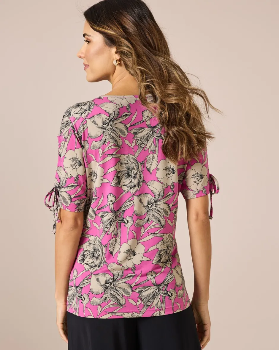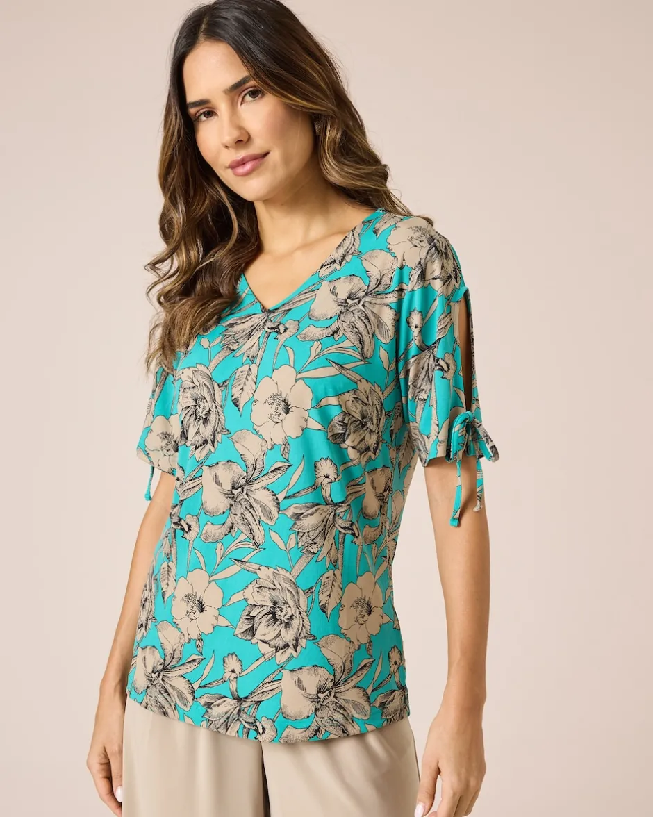 In diesem süßen Shirt blicken Sie dem Sommer gut gelaunt entgegen. Das Shirt begeistert mit einem schönen Blütenprint auf unifarbenem Grund. Raffiniertes Extra sind die Halbärmel mit Cut-outs, die mit einem Bändel verknotet werden. Ein femininer V-Ausschnitt macht das Design komplett. Der Fashion Hit ist der perfekte Begleiter zu einfach allem. Das feinelastische Shirt ist zudem figurbetont geschnitten und formt eine schöne und schlanke Silhouette.
