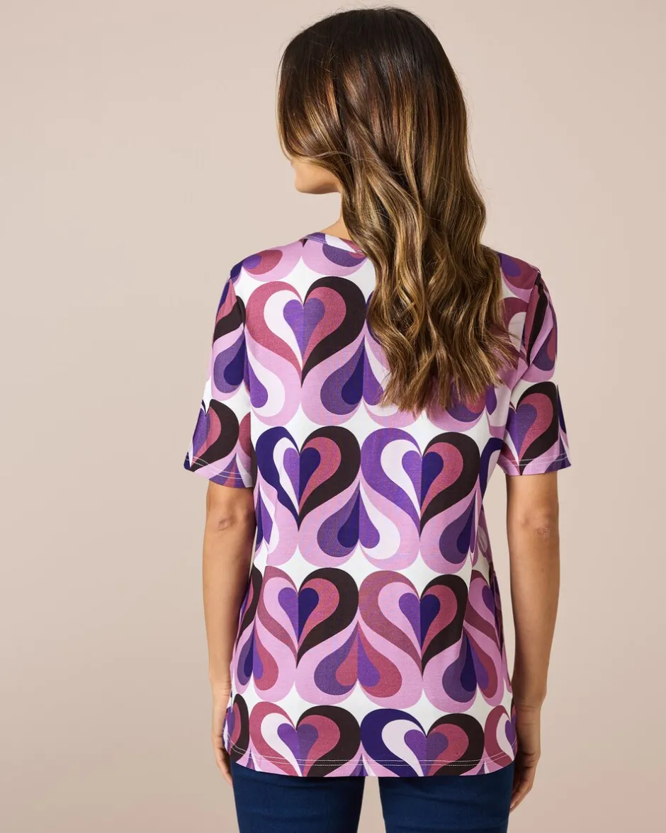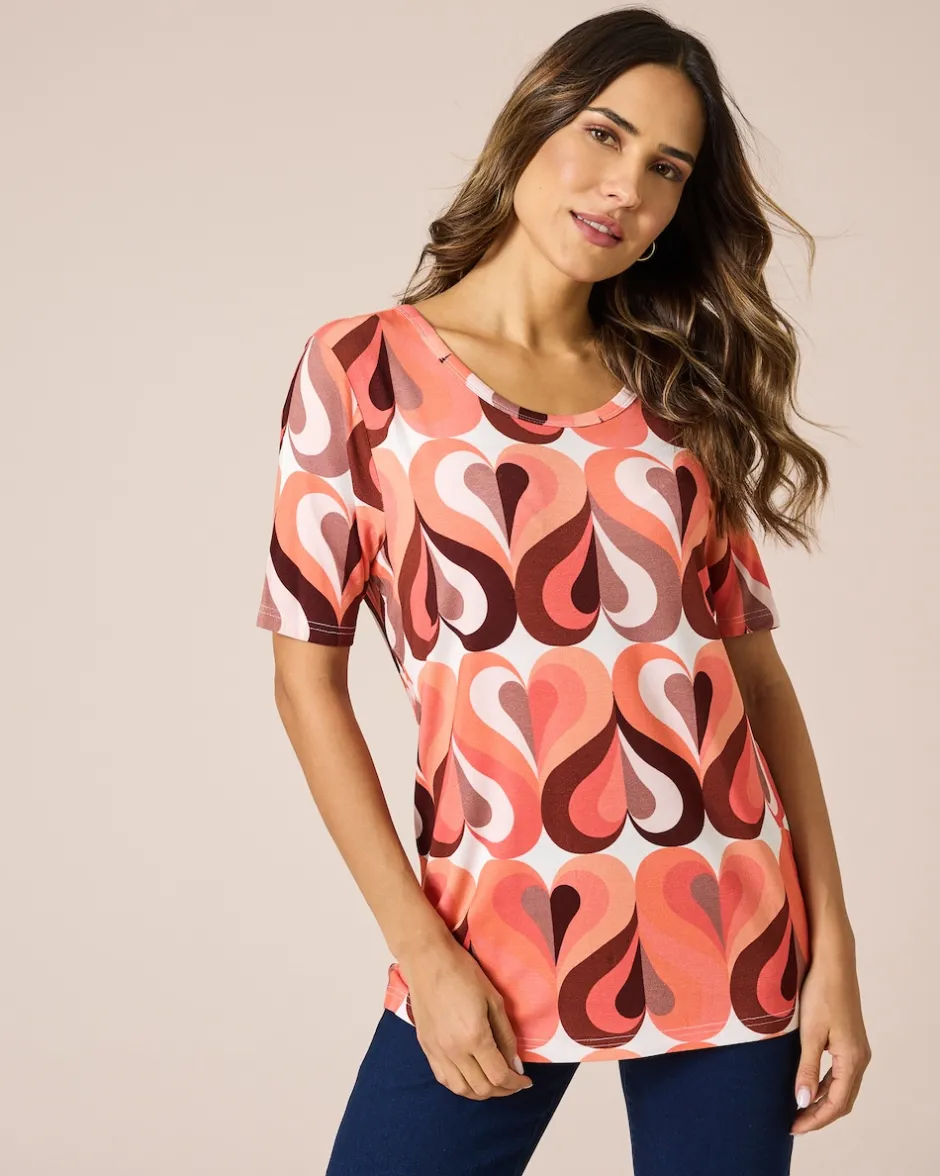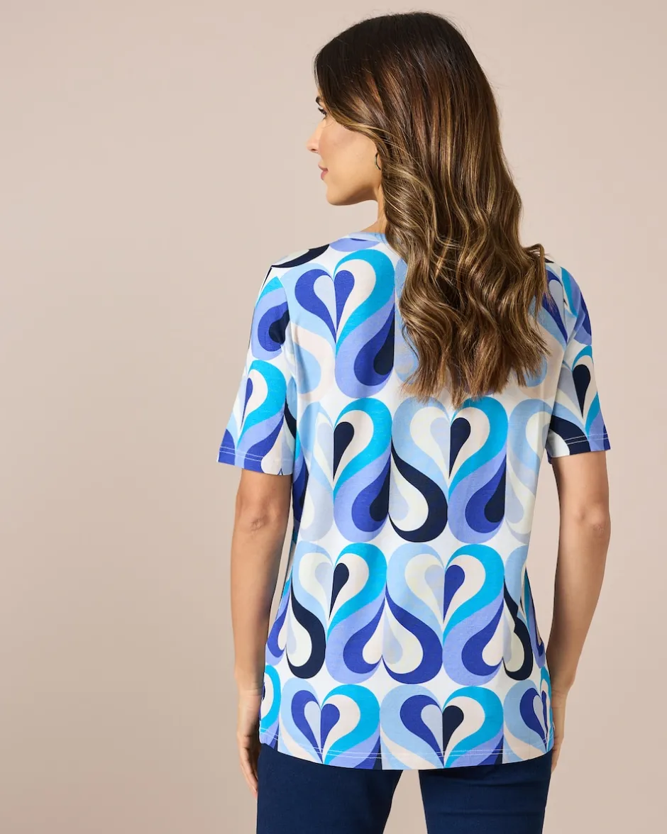 Herz ist Trumpf bei diesem zauberhaften Shirt, das neben seinem schicken Design auch durch erstklassigen Tragekomfort begeistert. Das Allover-Muster mit Herzmotiven erinnert in seiner Retro-Optik an die Ästhetik der 70er Jahre. Geschnitten in figurnaher Form, zaubert das Shirt eine schöne, feminine Silhouette. Das Besondere an diesem Fashion-Piece: Es ist aus Lenzing EcoVero™ Viskose gefertigt, einer nachhaltigen Faser, die gut für die Umwelt ist und so ein rundum gutes Gefühl vermittelt.