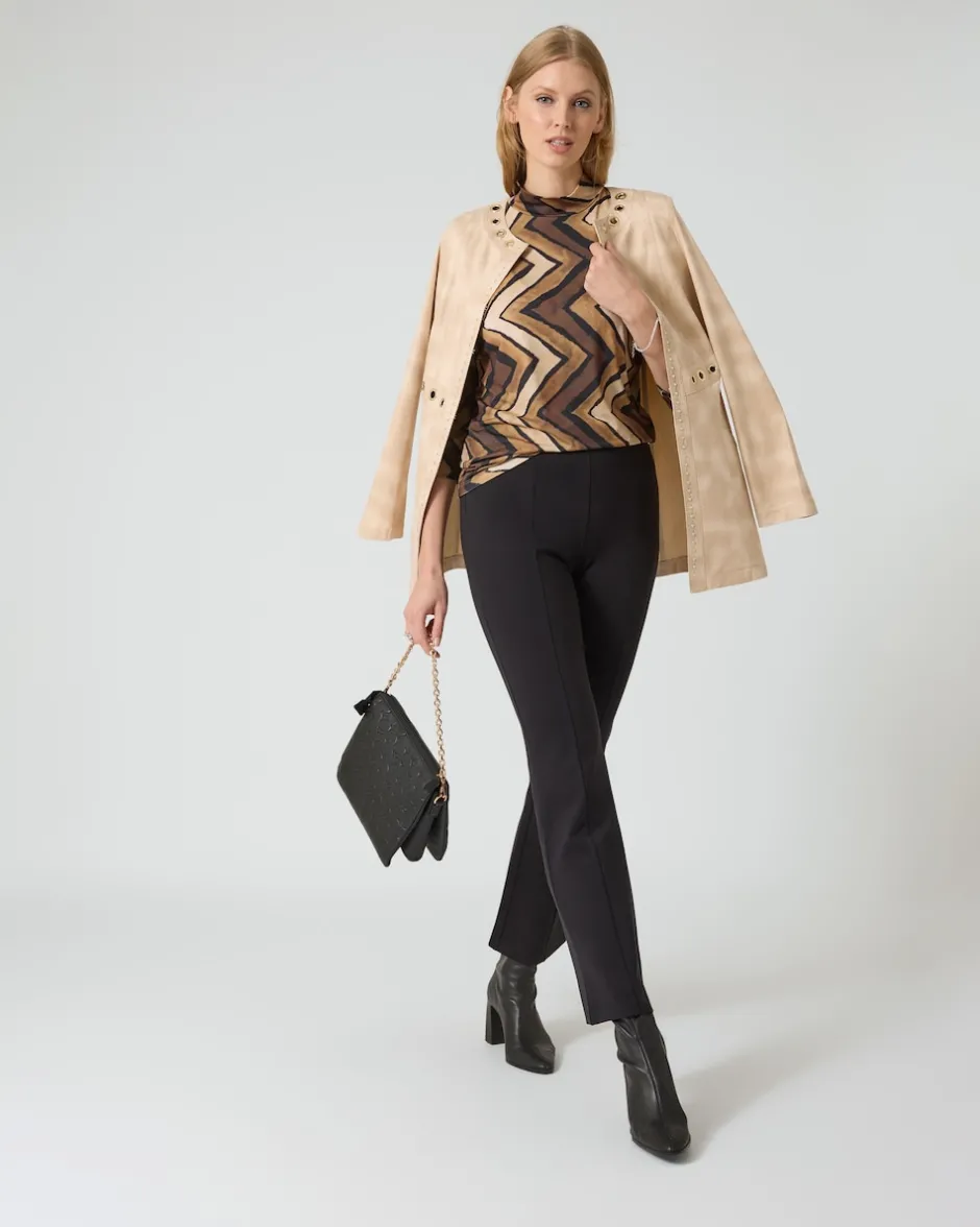 Dieses coole Shirt aus der Pfeffinger Kollektion sieht zu schicken Hosen und Blazer genauso toll aus wie zu Lederjacke und Jeans. Wie sie es auch stylen – der Look überzeugt. Die Besonderheit ist hier der coole Zick-Zack-Print, der in seiner weichen Gestaltung an ein Aquarellbild erinnert. Ein kurzer Stehkragen, ¾-Ärmel und die figurbetonte Silhouette runden die Ausstattung ab.