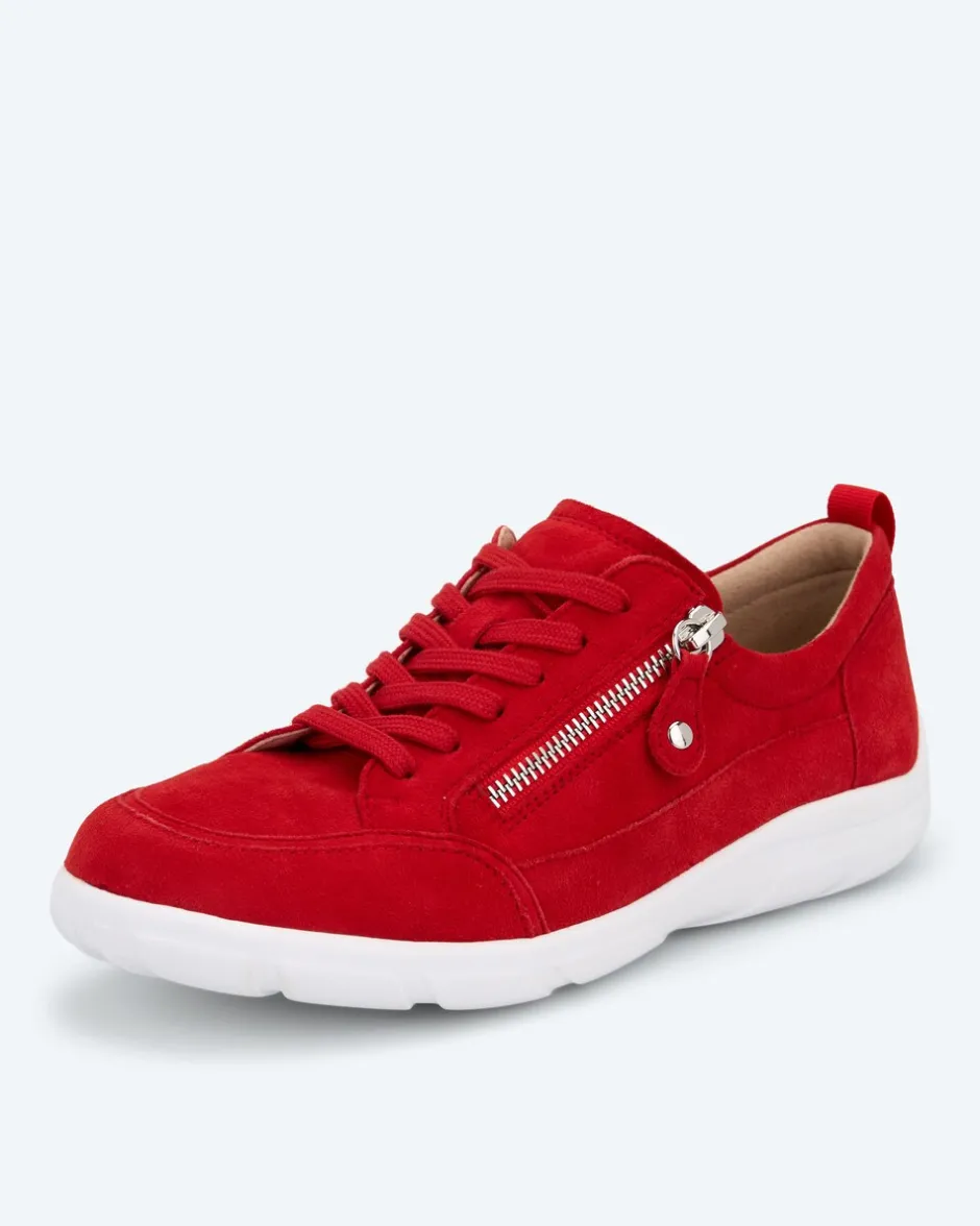 Unser Sneaker in Velours-Optik ist die perfekte Mischung aus Stil und Funktionalität. Die runde Form und die edle Textur verleihen ihm einen eleganten Look, während die Schnürung und der Reißverschluss für eine optimale Passform sorgen. Die bequeme Weichschaum-Innensohle und das auswechselbare, bei 30 Grad waschbare Fußbett gewährleisten höchsten Tragekomfort. Ein gepolsterter Schaftrand und eine besonders flexible und leichte Laufsohle machen diesen Sneaker zum idealen Begleiter für den ganzen Tag. Abgerundet wird das Design durch eine Fersenlasche mit dem Caprice-Logo. Kombinieren Sie diesen Sneaker mit einer schicken Chino-Hose für einen Business-Look oder mit Ihrer Lieblingsjeans für ein lässiges Tages-Outfit.