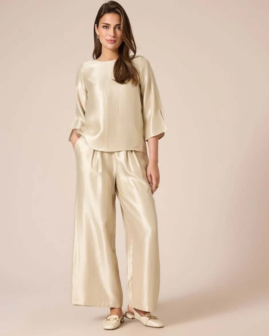 Die modische Judith Williams Hose ist weit geschnitten und umspielt in glänzender Viskose-Mix-Qualität Ihre Beine. Durch die markanten Falten auf der Vorderseite erhält die verkürzte Culotte im weiten Schnitt ein elegantes Update. Der bequeme Teildehnbund sitzt locker auf Nabelhöhe und seitliche Taschen runden das Design gekonnt ab. Freuen Sie sich auf einen neuen Partner für Ihre eleganten Abend-Outfits. Eine schwarze Bluse dazu und hohe Schuhe – fertig ist Ihr Gala-Look.