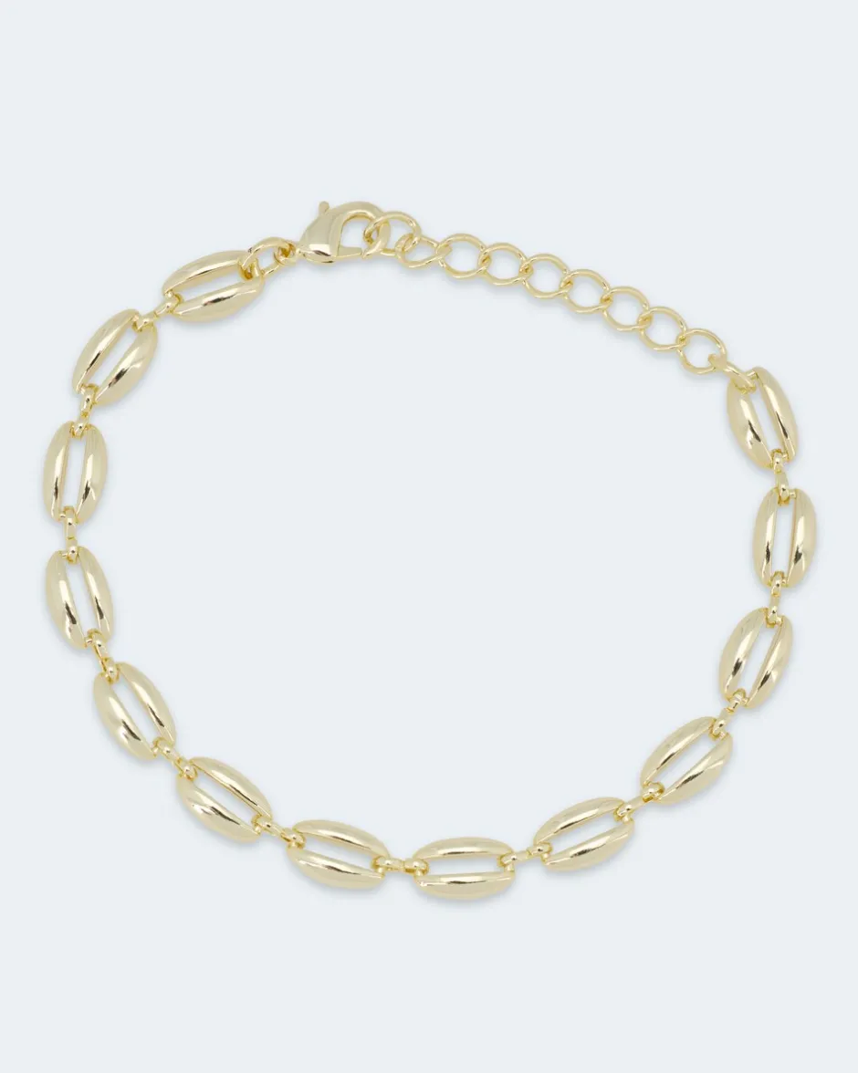 Das Armband steht Ihnen gelbvergoldet mit warmem Goldschimmer zur Verfügung oder palladiniert in kühl-eleganter Platinoptik – beide auf Hochglanz poliert. Das Armband besteht aus vielen großen Gliedern, die sich elegant um Ihr Handgelenk schmiegen. Das perfekte Accessoire zu Lederjacken oder sexy Oberteilen aus Mesh. Verschlossen wird das Armband mit einem sicheren Karabiner.