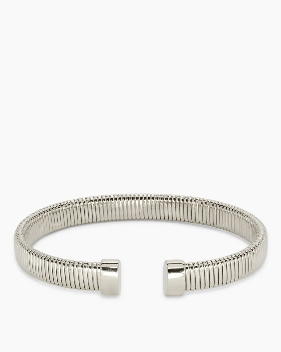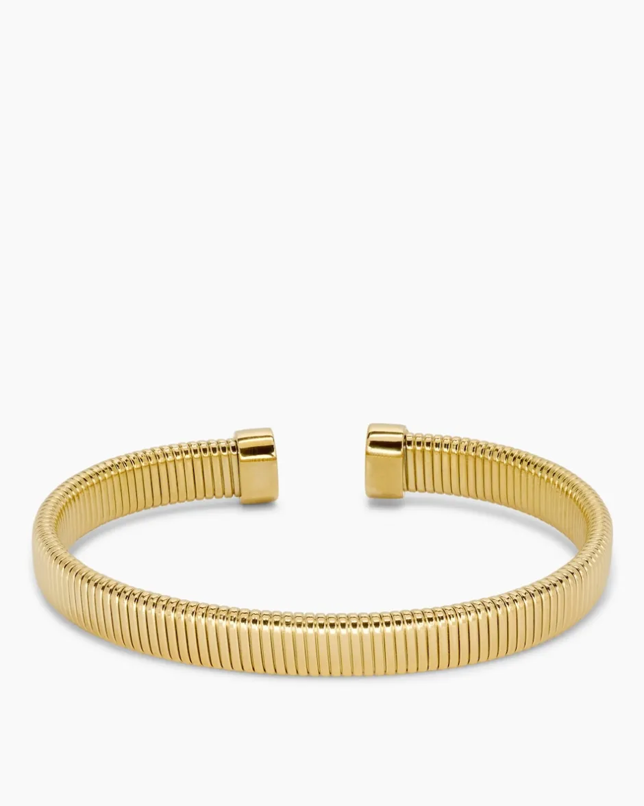 Mit seinem klassisch eleganten Rillen-Design ist dieser Armreif ein idealer Alltagsschmuck. Aber auch zu einem ausgewählten Outfit kann er richtig classy aussehen. Während als Grundmaterial Edelstahl verarbeitet wurde, kann der Schmuck auch in einer gelbvergoldeten Variante bestellt werden. Er ist rund acht Millimeter breit. Der Reif ist als Spange gestaltet und wird ganzeinfach übergestreift.