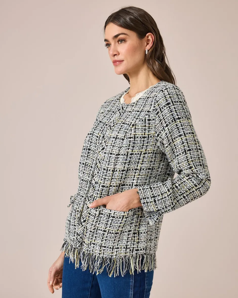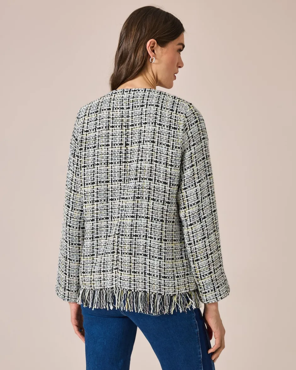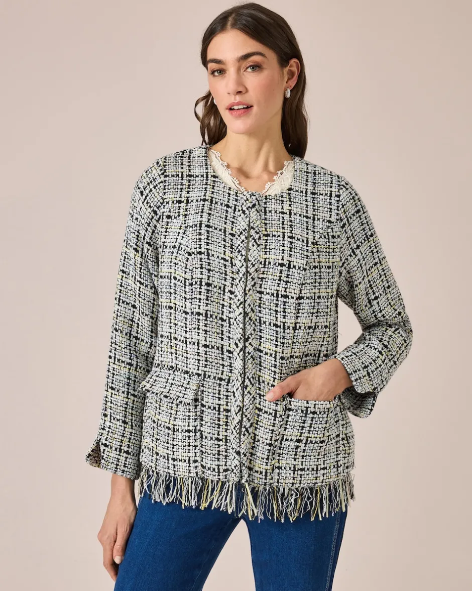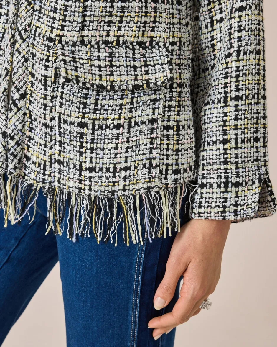 Mit diesem Blazer von Alfredo Pauly verleihen Sie Ihrem Look das gewisse Etwas. Sein modischer Style entsteht durch die langen Fransen am Saum, aber auch durch den legeren Rundhalsausschnitt und verdeckten Hakenverschluss. Klassisch elegant wiederum ist die griffige Bouclé-Qualität mit Karomuster. Tragen Sie Ihren neuen Blazer zu eleganten Hosen oder lässigen Jeans – das Ergebnis wird immer toll aussehen.