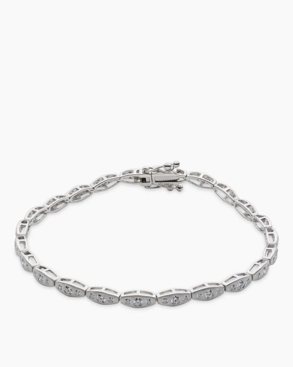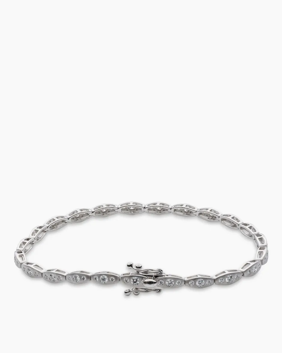 Einfach nur elegant: Die Schönheit der lupenreinen Brillanten und das schmeichelnde Design machen dieses Armband zu einer Kostbarkeit, die jede Garderobe adelt. Längliche, ovale Platin-Elemente sind dicht an dicht nebeneinandergesetzt und halten die wunderbaren Brillanten. Je drei Edelsteine sind in glatten Zargenfassungen auf jedem Platin-Element angeordnet. Auch das Kastenschloss mit Sicherheitsachten ist mit Brillanten besetzt. So wirkt das Armband wie aus einem Guss – geschmackvoll klar und wunderschön. In diesem faszinierenden, wertvollen Schmuckstück sind zeitlose Eleganz und moderne Gestaltung perfekt vereint.