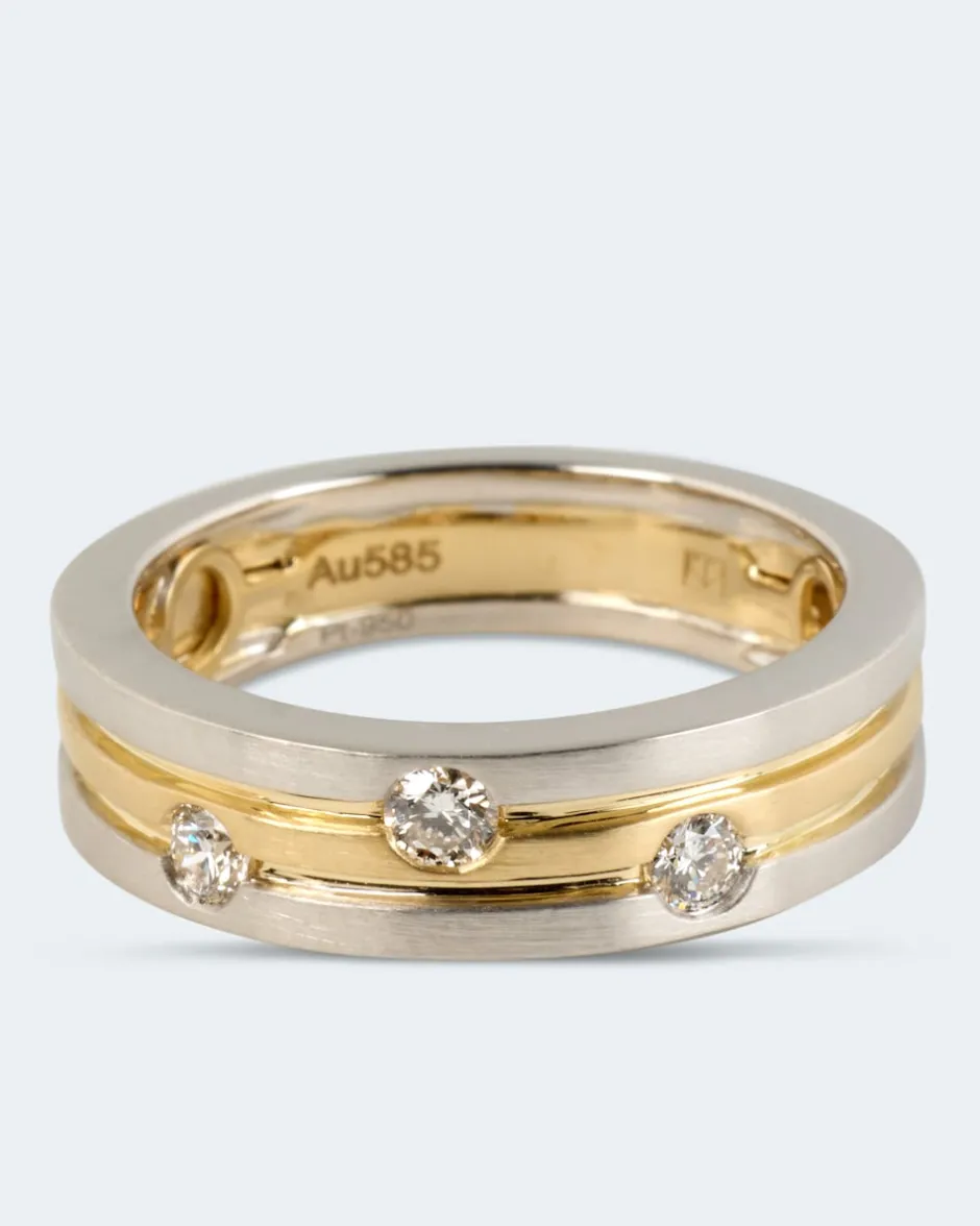 Entdecken Sie die perfekte Symbiose von Eleganz und Qualität mit unserem Brillantring von Diamantaire. Dieses exquisite Schmuckstück vereint 950er Platin und 585er Gelbgold in einem einzigartigen Design. Die mittlere Ringschiene aus Gelbgold wird von zwei äußeren Schienen aus Platin umrahmt, was einen ansprechenden Kontrast ergibt. Teilmattiert für einen subtilen Glanz, ist dieser Ring mit 3 lupenreinen weißen Brillanten besetzt. Bei einer Schliffgüte von sehr gut besitzen diese Edelsteine zusammen etwa 0,20 ct. Erleben Sie den luxuriösen Charme dieses meisterhaften Rings.