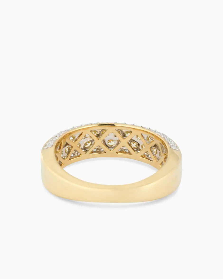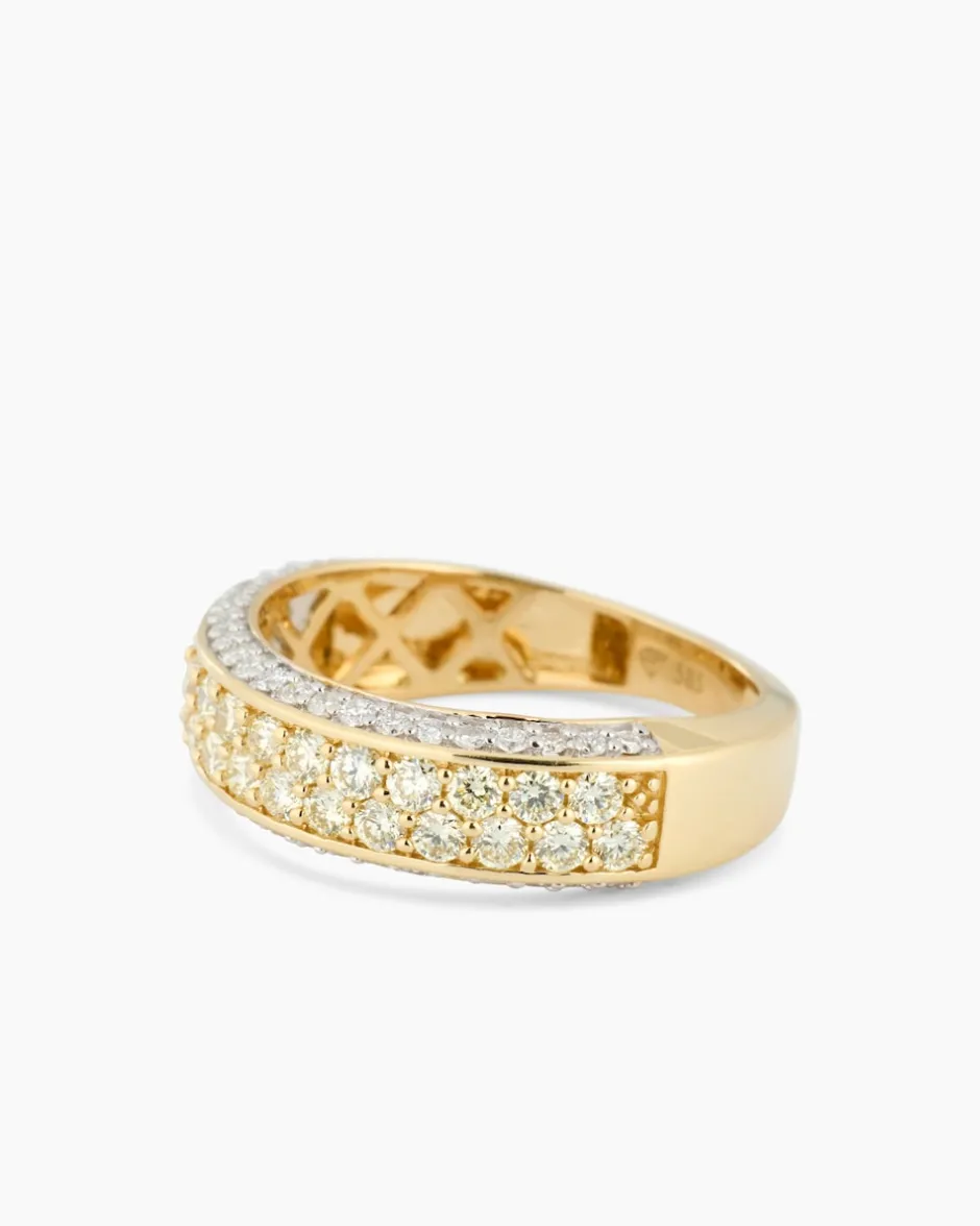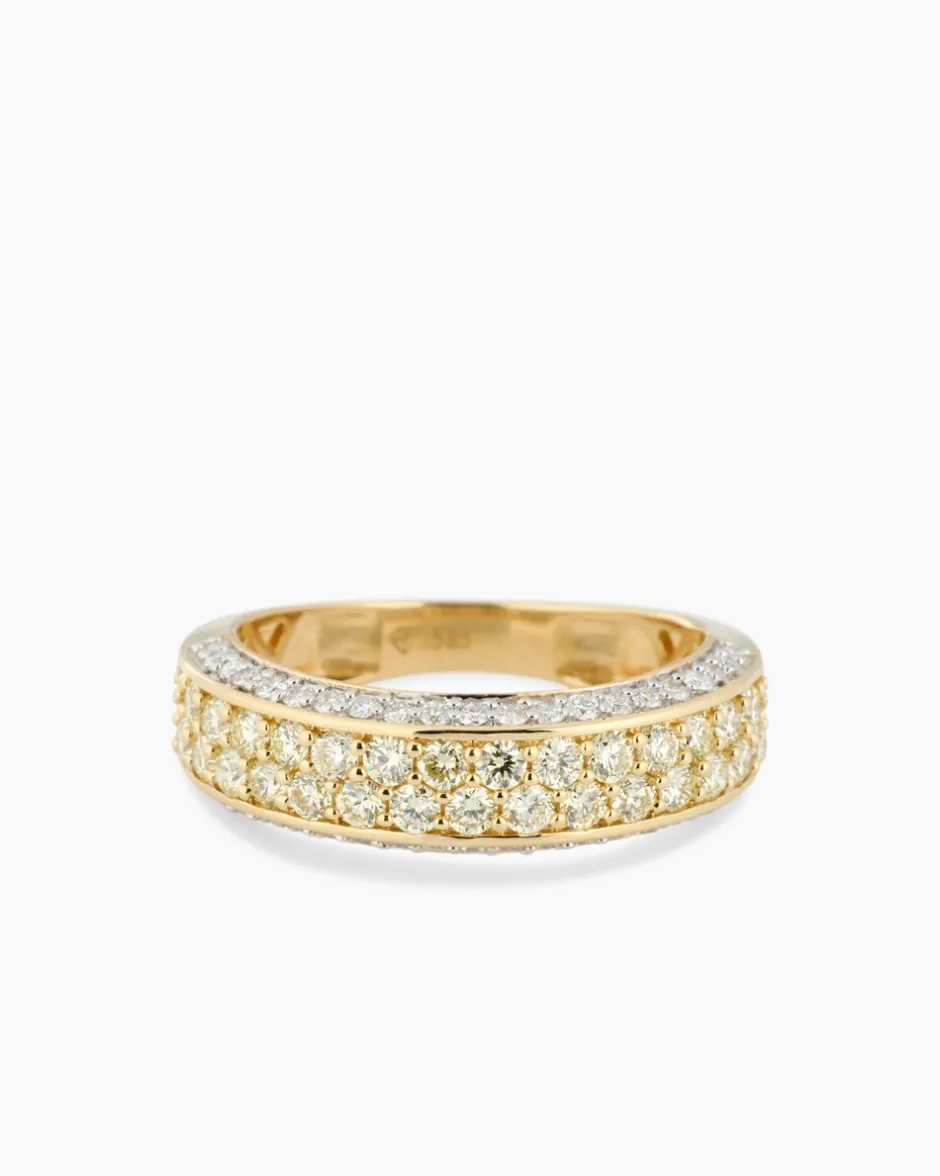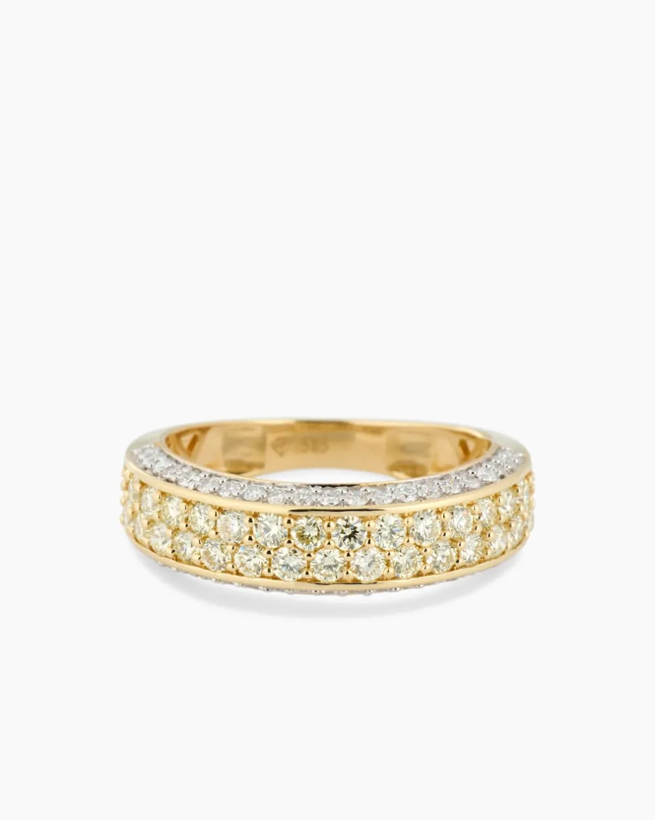 Der atemberaubend schöne Bandring aus feinem 585er Gelbgold hält 29 gelbe und 42 weiße Brillanten – ein beeindruckender Anblick. Die gelben Brillanten sind dicht an dicht im Pavé gefasst und bedecken eine Seite der Ringschiene. In Kombination mit den weißen Steinen kommt ihr natürliches Gelb noch viel besser zur Geltung. Um das Funkeln der weißen Brillanten zu unterstützen, sind die gelbgoldenen Krappen teilweise rhodiniert. In der klaren Form des Rings entfalten die wunderschönen Steine ihre Magie. Für Ihren Tragekomfort und damit der Ring immer gut sitzt, wird die Ringschiene nach hinten etwas schmaler. Bereichern Sie Ihr Schmuck-Kollektion um dieses edle Schmuckstück mit Blickfang-Garantie.