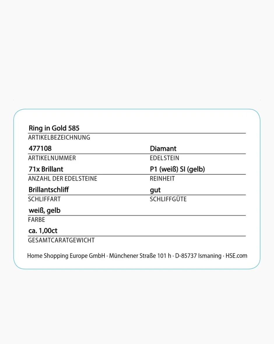 Selbstverständlich ist das 585er Gold, das die wertvollen Brillanten hält, von ausgesuchter Qualität. In diesem Punkt gehen wir keine Kompromisse ein. Deshalb werden unsere Schmuckwaren von unserer Qualitätssicherung und seitens des Lieferanten strengsten Prüfprozessen unterzogen und unter anderem auf Konformität mit den Bestimmungen der Schweizer Edelmetallkontrollgesetzgebung geprüft.