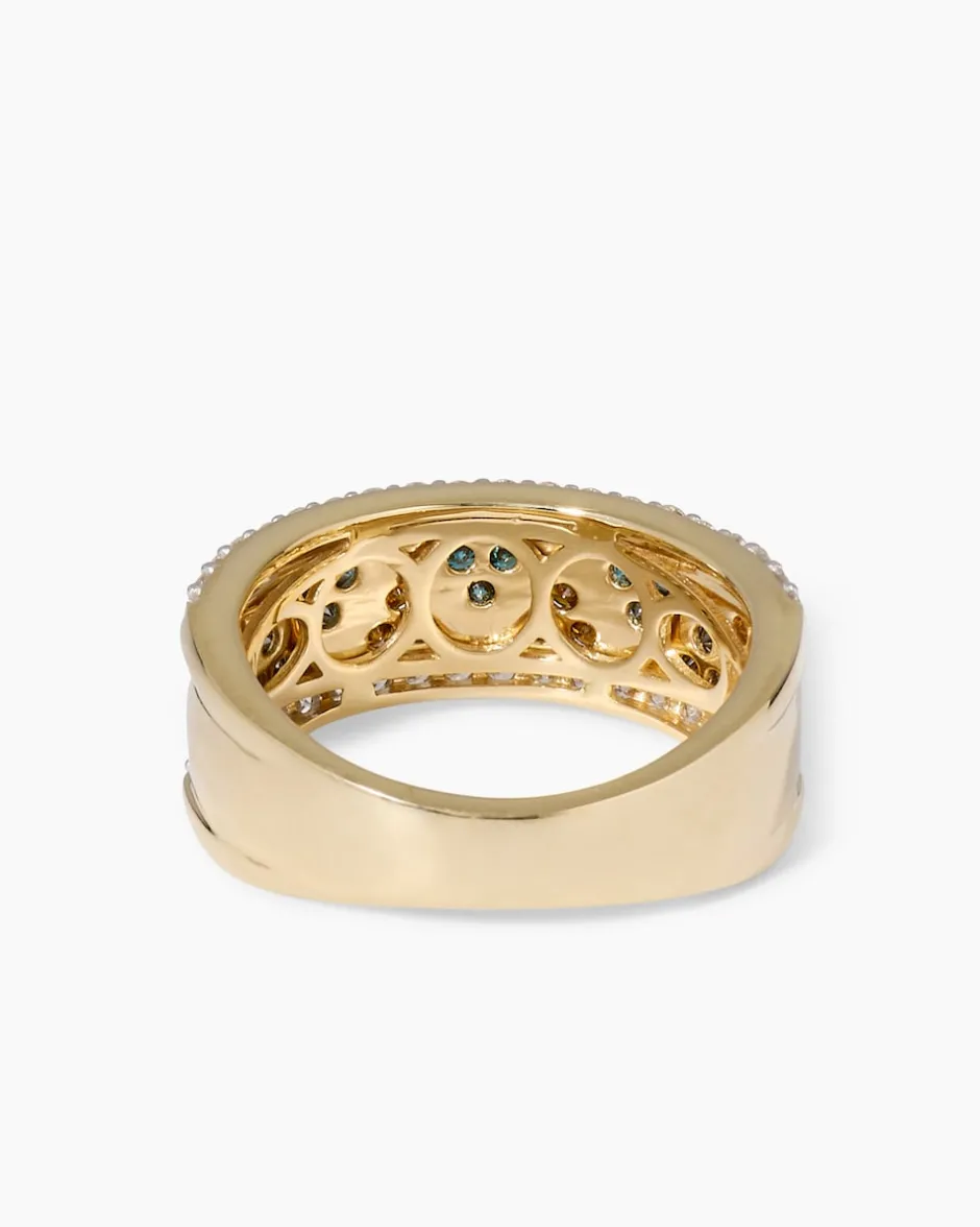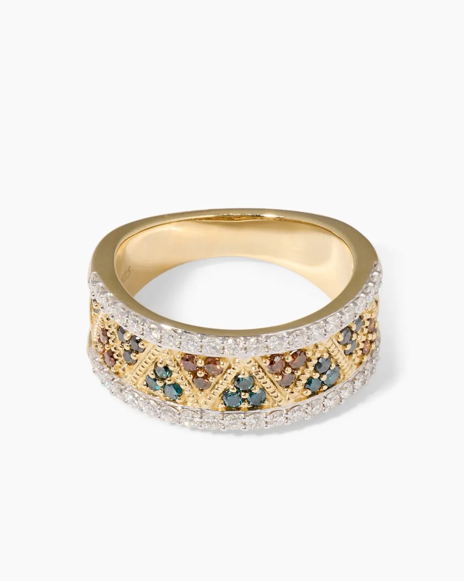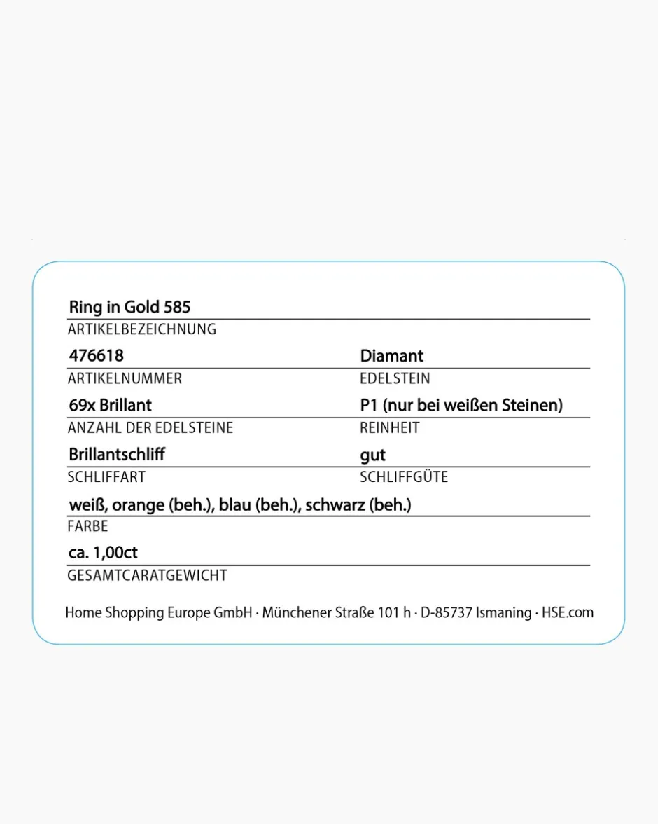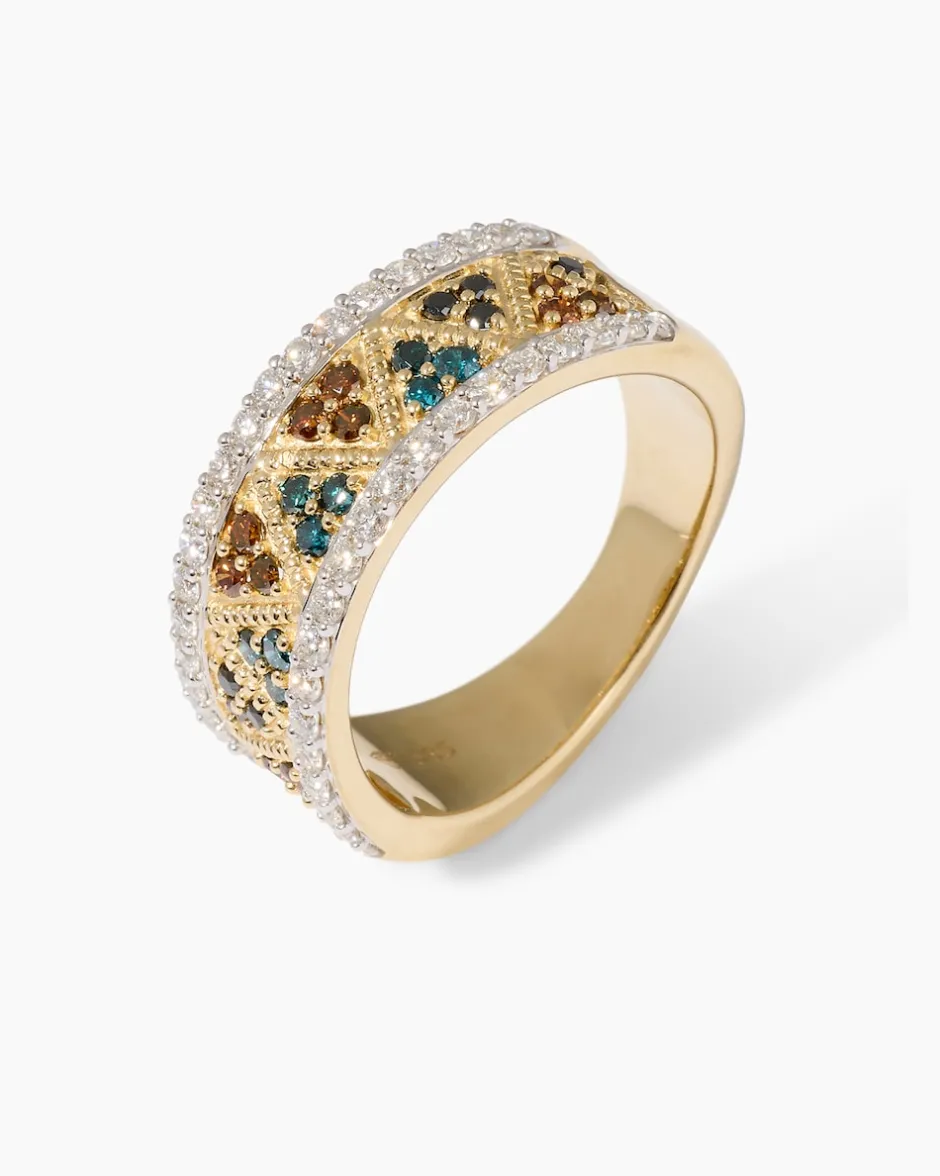 Ihr neuer Lieblingsring aus der Schmucklinie Diamond Collection ist in dynamischer Multicolor-Optik gearbeitet und mit 69 Brillanten in Blau, Weiß, Orange und Schwarz bestückt. Die luxuriösen Steine sind teilweise behandelt, gut geschliffen, verfügen über die Reinheit P1 und werden in Krappenfassungen gehalten. Die farbigen Brillanten sind auf der Ringschiene in Dreiecken angeordnet und ergeben ein interessantes Muster. Die Kanten des Bandrings sind im Kontrast mit weißen Steinen besetzt. Wenn Sie eine Schwäche für Brillantschmuck haben, dann wird dieser Ring Ihre private Schmuckkollektion ideal ergänzen. Er wirkt einfach immer nobel und elegant.