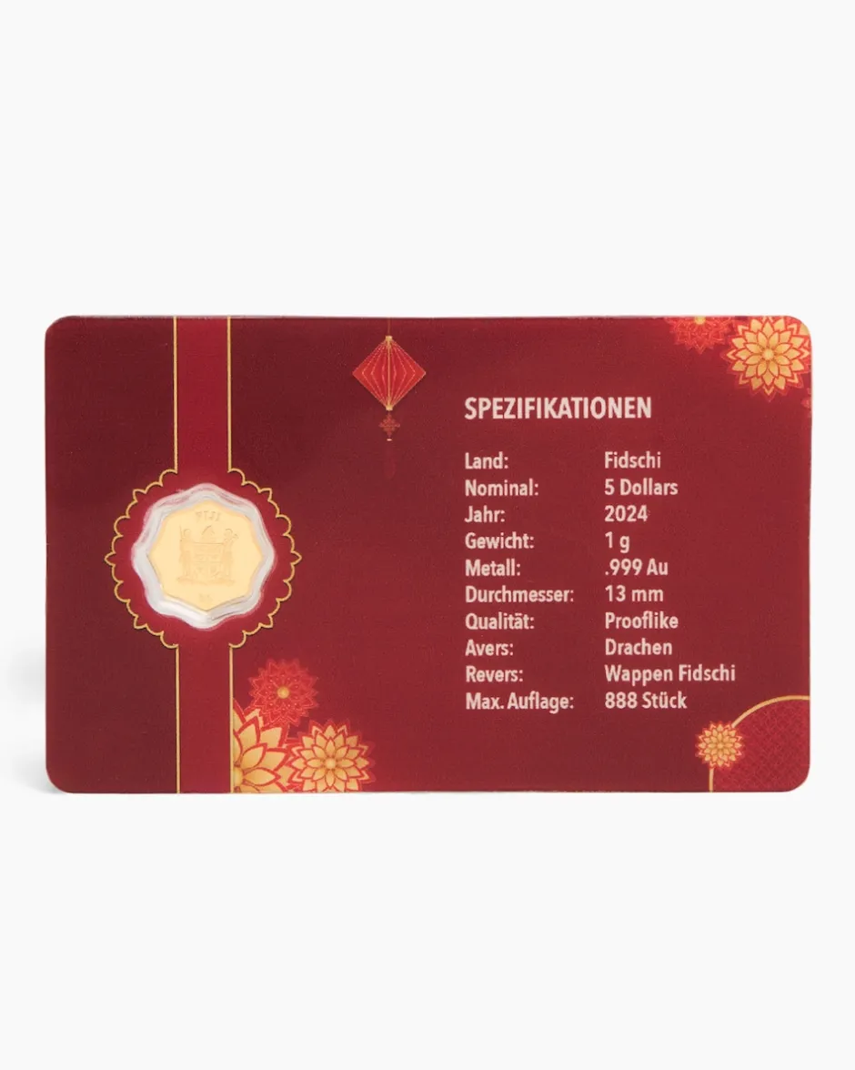 | Kurzbezeichnung: | 1 g Gold Blossom Shape Drache 2024 in Gold Coin Card | |