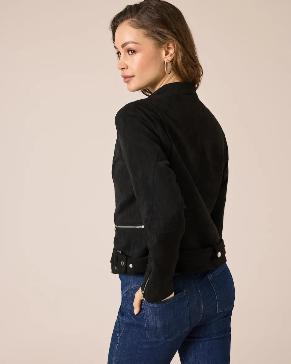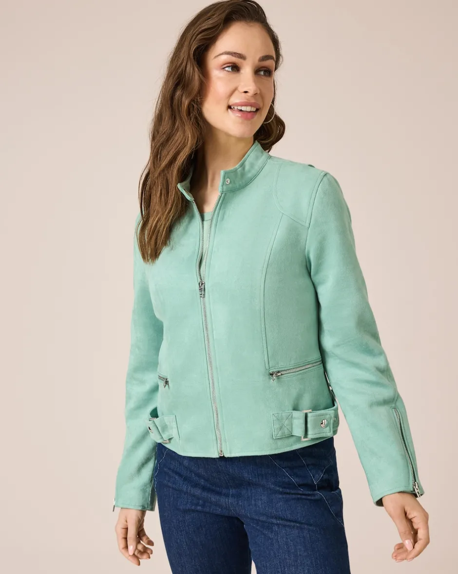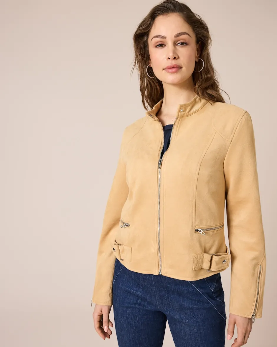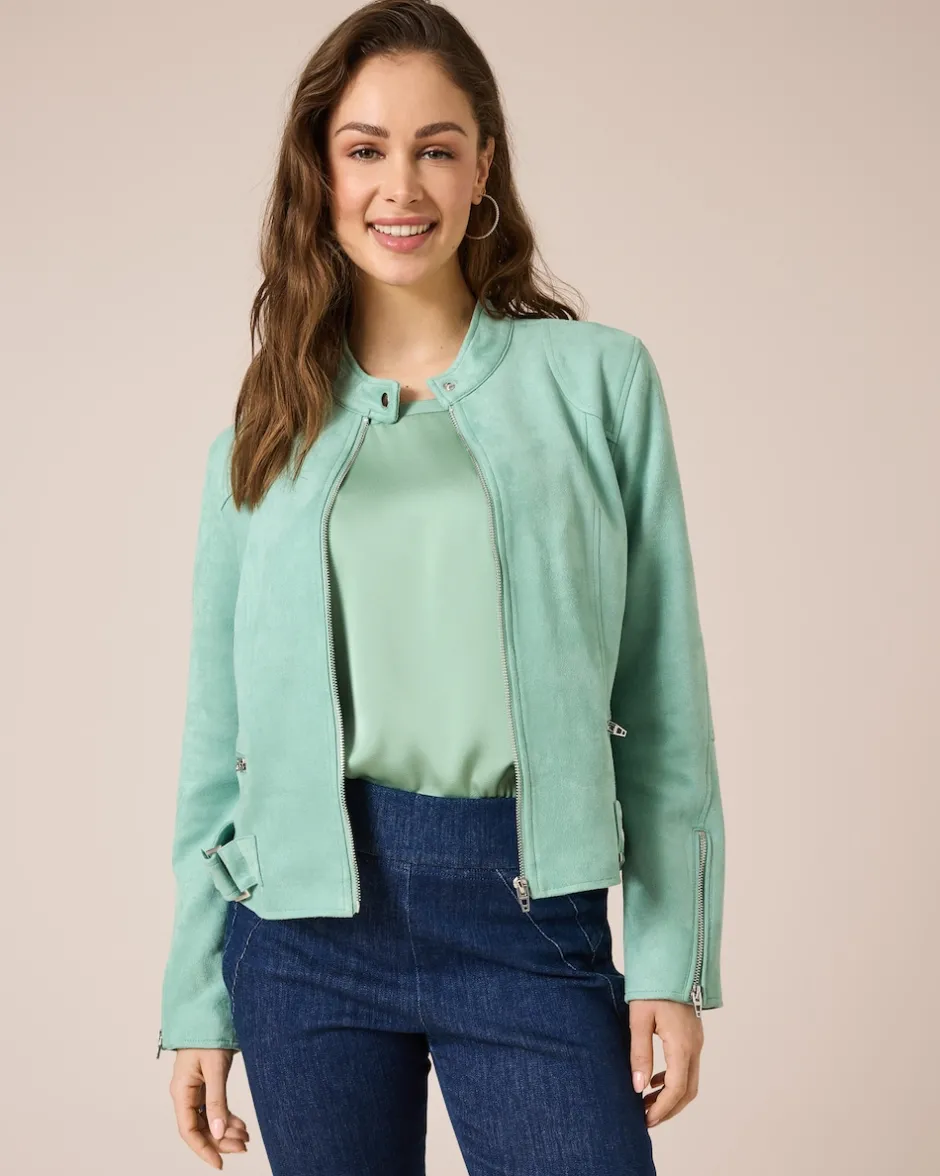 Setzen Sie ein Statement mit unserer lässigen kurzen Jacke aus feinem Wildlederimitat. Die elastische Qualität sorgt für eine optimale Passform und hohen Tragekomfort. Die Jacke ist im angesagten Biker-Style designt und zeigt die charakteristischen Reißverschlussdetails an Ärmeln und Taschen. Der gerade Saum ist mit rockigen Riegeln verziert. Formende Teilungsnähte betonen Ihre Silhouette, während das angenehme Innenfutter für einen Hauch von Luxus sorgt. Ob fürs Büro oder schicke Abendveranstaltungen – mit der Biker-Jacke genießen Sie immer einen lässigen Auftritt.