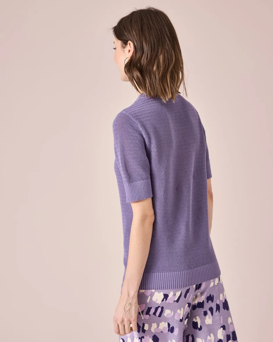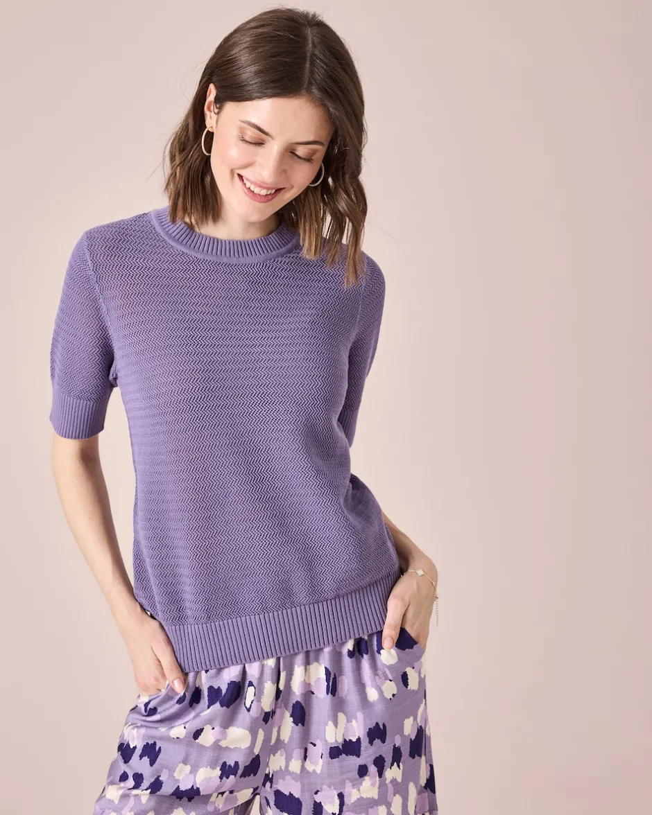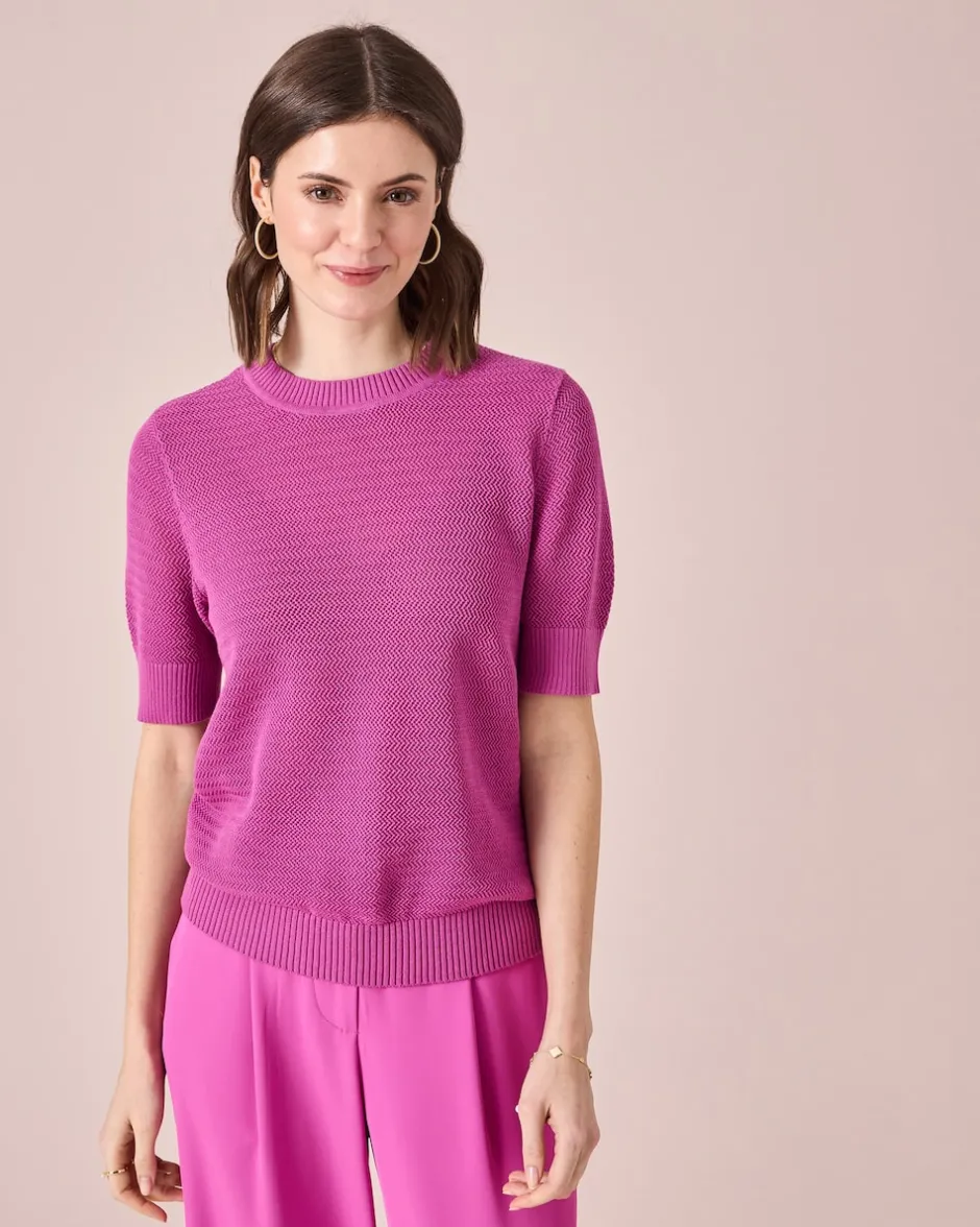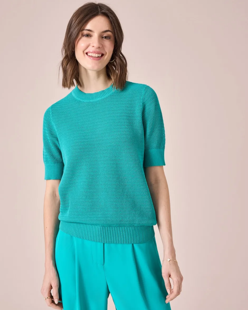 Der Pullover aus reiner Baumwolle ist unifarben und ein echtes Allround-Talent, das zu allem passt. Der Pullover ist mit einem Strukturmuster gestrickt und hat kurze Ärmel. Dazu gibt es einen klassischen Rundhals und Rippbündchen an den Ärmeln und am Saum. Ob lässige Jeans, feine Stoffhose oder stylischer Rock – Sie können den Fashion Hit mit allem kombinieren.