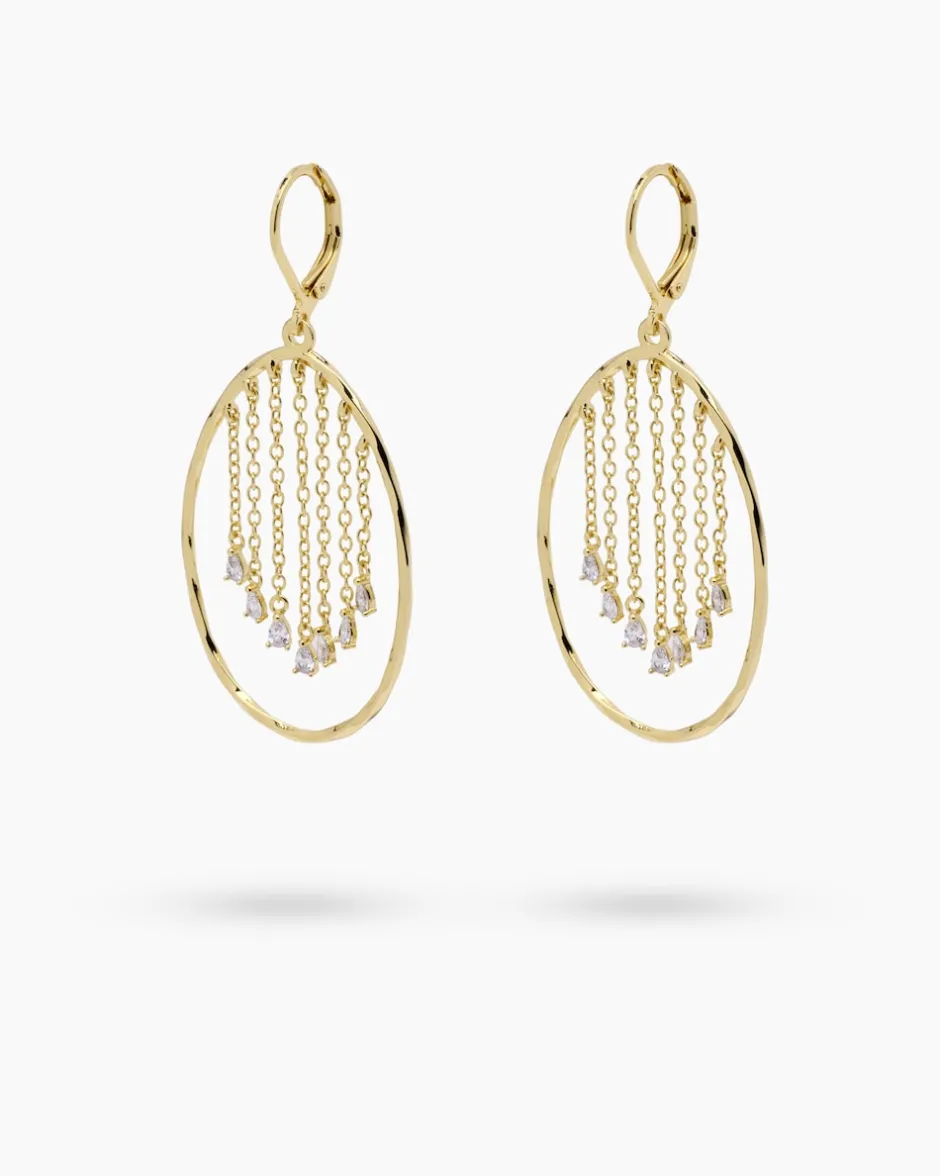 Mit diesem tollen Eyecatcher-Schmuck von Claris Vienna Jewelry Art wird Ihr Outfit perfekt. Durch das einfarbige Design lassen sich die Ohrhänger in langer, ovaler Form besonders gut kombinieren und harmonieren mit unterschiedlichsten Outfits. Im Inneren der Ovale sind je sieben Ketten in unterschiedlichen Längen befestigt, die mit einem Zirkonia-Tropfen in einer Krappenfassung enden. Die beweglichen Ketten machen jeden Ihrer Schritte dynamisch mit und geben den Accessoires einen attraktiven Glamour-Touch. Entscheiden Sie sich für die gelb-, rosévergoldete oder palladinerte Variante und freuen Sie sich drauf, den Schmuck zum ersten Mal zu tragen.