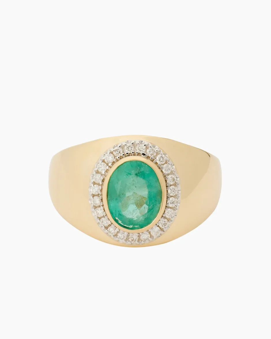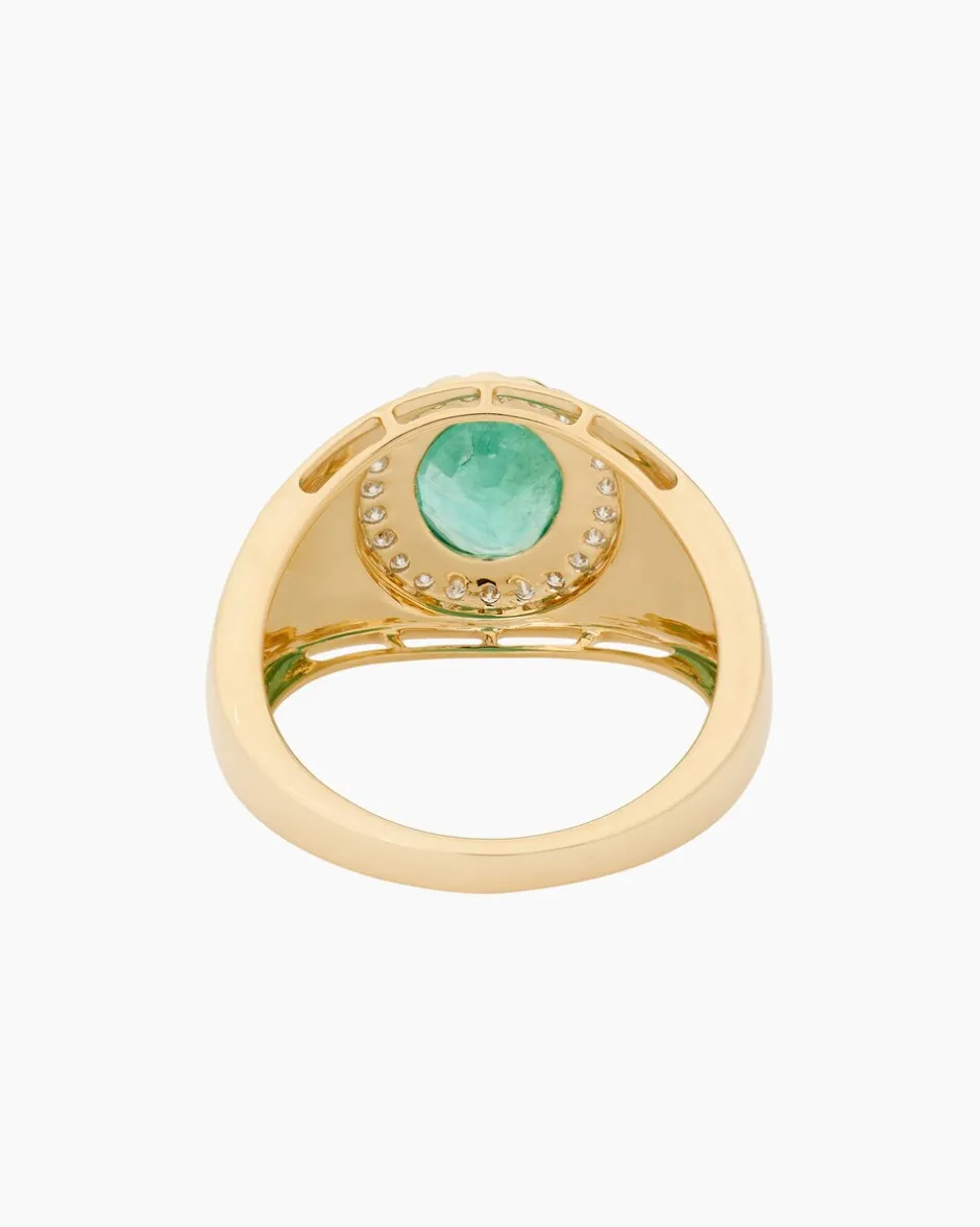 Ein Sambia Smaragd ist ein besonders wertvoller und schöner Edelstein, der bei diesem Ring mittig auf dem Ringkopf seine ganze Pracht entfaltet. Der ovale Smaragd ist facettiert und schillert bei Lichteinfall in allen Grüntönen. Zusätzlich ist der Ring aus hochglanzpoliertem Gelbgold 585 mit 23 weißen Brillanten in P1-Reinheit verziert. Die runden Brillanten sind im Brillantschliff veredelt und glitzern in zarten Zargen gefasst traumhaft schön. Eine zeitlos schöne Kombination, die Ihre Hand zum Blickfang macht und jede Ihrer Gesten mit einem spektakulären Funkeln begleitet. Schmuckmagie von Harry Ivens.