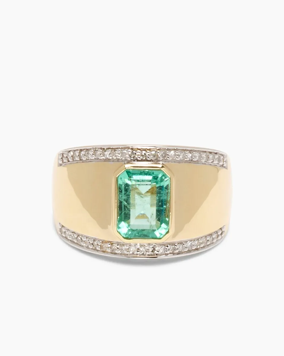 Dieser herrliche Goldring von Harry Ivens besticht durch sein wundervoll großzügiges, elegantes Design. In der Mitte der breiten Ringschiene sitzt ein imposanter Sambia Smaragd, im klassischen Smaragdschliff und mit satten 8 x 6 Millimetern Größe. Das klare, strahlende Grün harmoniert perfekt mit der warm glänzenden Gelbvergoldung (585). Als weiteres Highlight ist der Rand der Ringschiene mit insgesamt 42 Diamanten besetzt, alle in der Reinheit PI und mit einem Gesamtgewicht von rund 0,2016 ct. Freuen Sie sich auf einen kostbaren Edelsteinschmuck, der auch einer Königin gehören könnte.