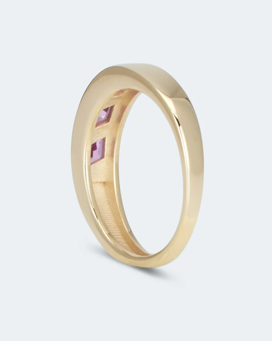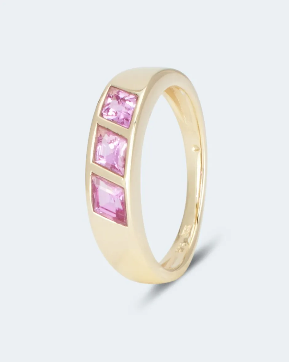 Drei wunderschöne Saphire in leuchtendem Pink sind der aufregende Blickfang bei diesem eleganten Goldring. Die Saphire werden von dezenten Zargen gehalten und begeistern nicht nur durch ihr Funkeln, sondern auch durch ihre ungewöhnliche Rautenform. Das Saphir-Trio ist zudem sorgfältig facettiert, dadurch ergeben sich ein herrliche Funkel-Effekte, wann immer Sie Ihr Handgelenk bewegen.