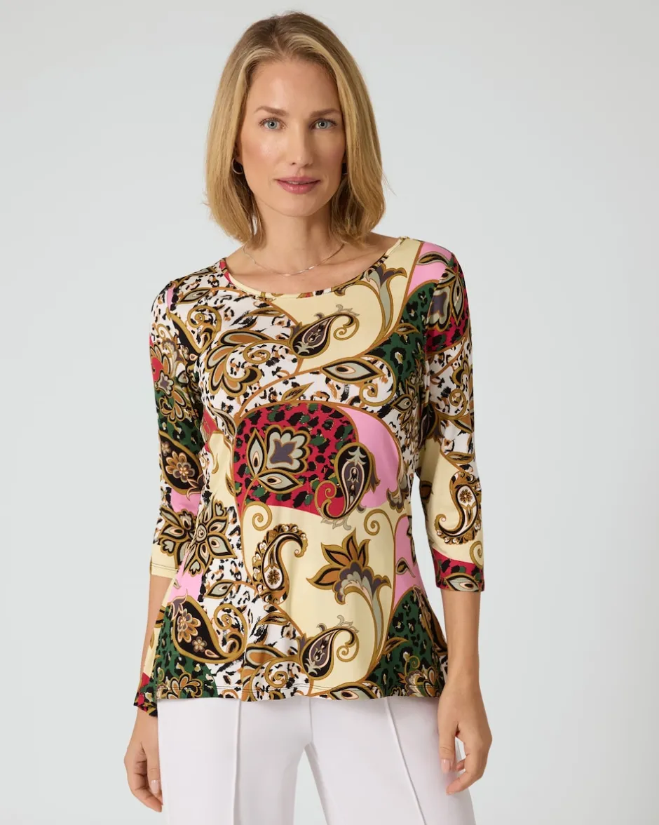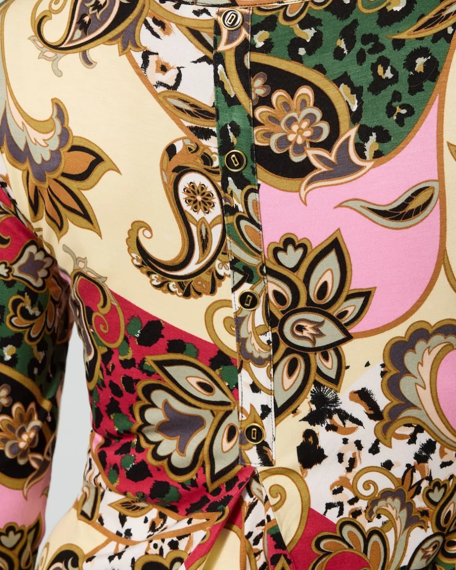 Das attraktive Designer-Shirt gefällt durch seine ungewöhnliche Gestaltung – perfekt für alle Frauen, die mit genormter Allerwelts-Mode nichts anfangen können. Auf der Rückseite ist es mit einer Knopfleiste vom Nacken bis auf Taillenhöhe gearbeitet. Darunter ist es leicht ausgestellt und mit verspielen Falten versehen. Das Ganze steht in drei Varianten zur Wahl, jeweils mit einem fantasievollen Druckmix aus unterschiedlichen Motiven.