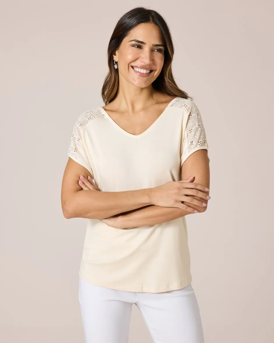 Lassen Sie sich von unserem Uni-Design Shirt begeistern, das Romantik und Modernität meisterhaft verbindet. Dieses Modell besticht durch sein halbtransparentes, blumiges Dekor in Spitzenoptik auf den Schultern – ein Hauch von Weiblichkeit und Eleganz in Ihrem Alltag. Der V-Ausschnitt vorne und hinten sowie die überschnittenen Schultern verleihen dem Shirt einen luftigen und entspannten Look. Der Kurzarm-Look sorgt für einen sommerlichen Touch, während der hochwertige Viskose-Stretch-Materialmix ultimativen Komfort bietet. Ob zu einer eleganten Hose oder einem lässigen Rock, dieses Shirt lässt sich vielseitig kombinieren und passt zu jeder Gelegenheit. Tragen Sie es beim gemütlichen Kaffee am Wochenende oder bei der abendlichen Gartenparty – unser Uni-Design Shirt ist Ihr perfekter Begleiter.