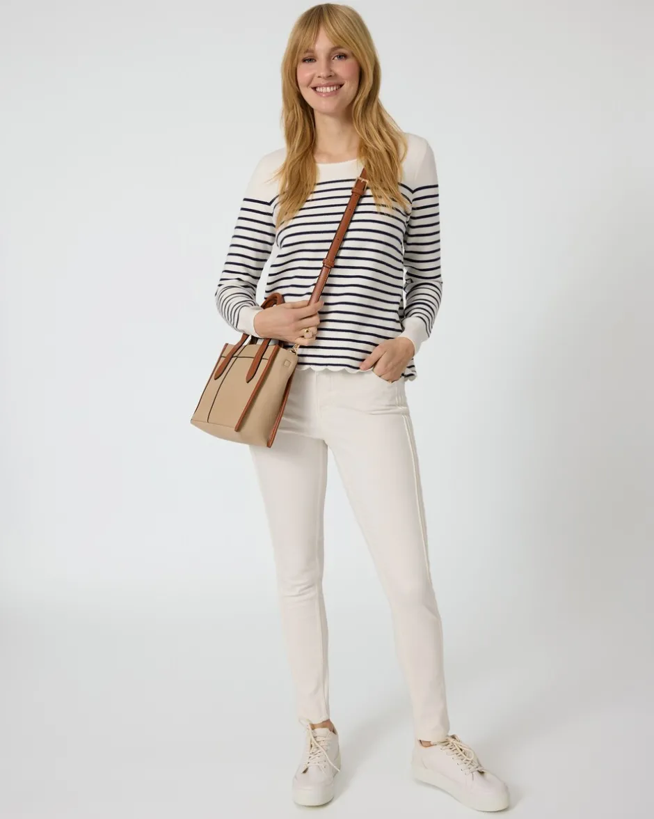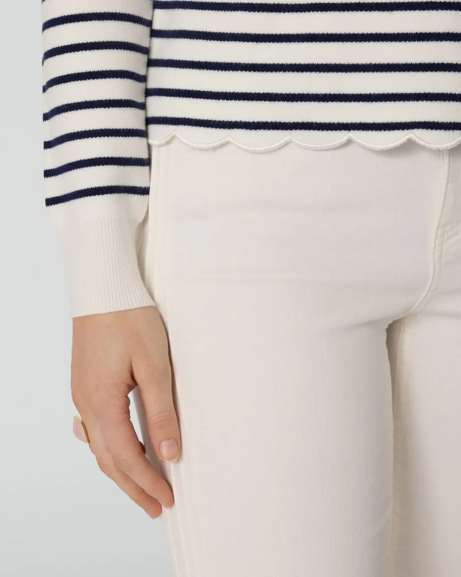 Auf den ersten Blick präsentiert Jana Ina mit diesem Mode-Piece einen klassischen Streifenpullover in Cremeweiß und Marine. Das Teilchen kommt allerdings mit ein paar stylischen Extras und wird so in jeder Kombination zum Eyecatcher. So ist ein breiter Streifen am Ausschnitt- und Schulterbereich sowie den gerippten Ärmelenden uniweiß gehalten. Verspielt und feminin erscheint der hübsch gewellte Saum. Das Design-Highlight aber findet sich auf der Rückseite, hier ist der Pulli mit einem großen, dreieckigen Schlitz am Saum verziert.
