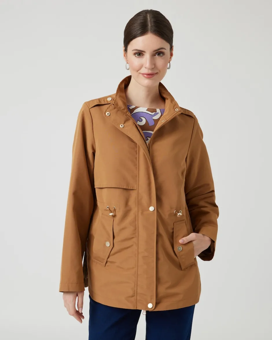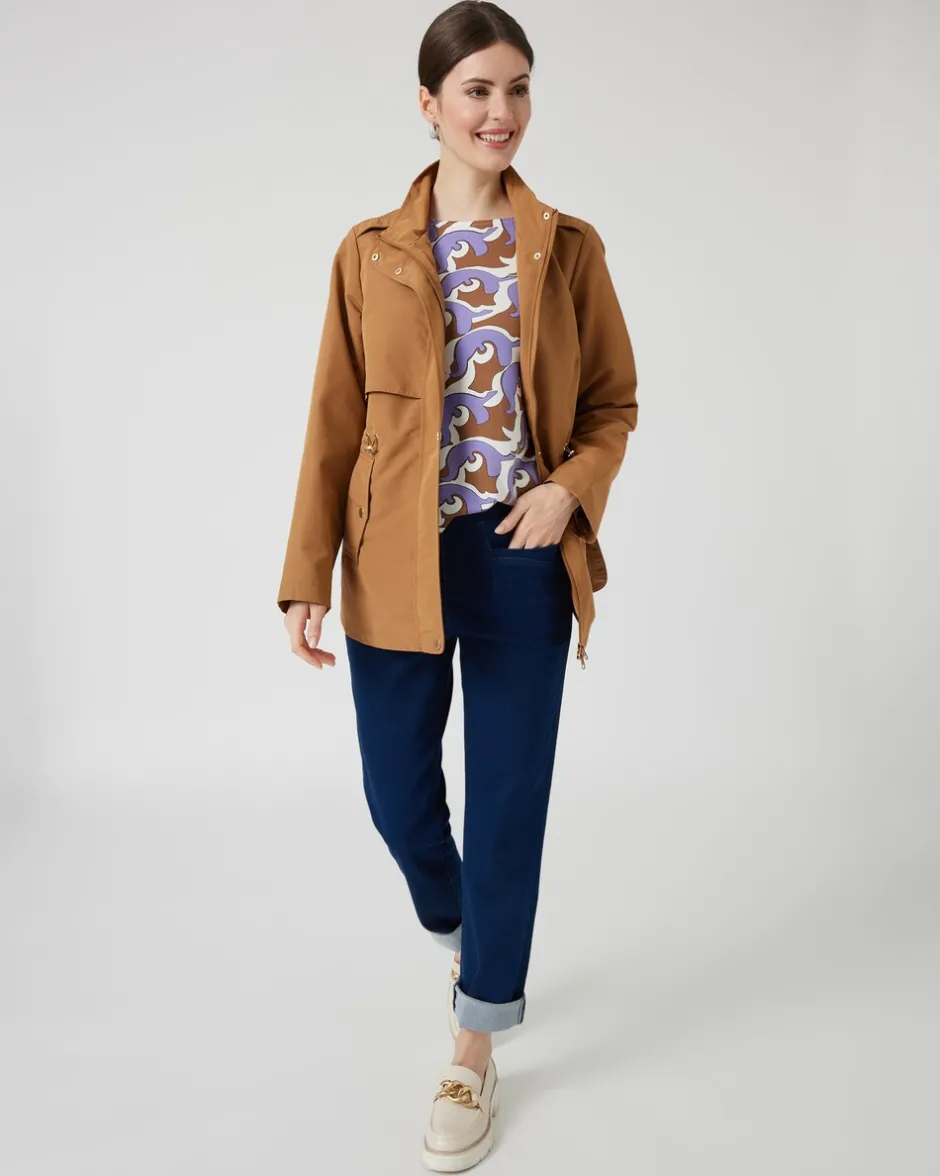 Als vielseitige Übergangsjacke überzeugt dieses charmante Modell im sportlich-eleganten Parka-Stil. Ob zu unkomplizierten Alltags-Jeans oder schicken Hosen kombiniert – diese Jacke passt. Neben der eleganten Webqualität bestimmen der taillierte Schnitt mit Tunnelzug in der Taille und der lässige Stehkragen mit Schulterklappe das betont feminine Design. Ausgestattet mit praktischem 2-Wege-Reißverschluss und zusätzlicher Knopfleiste, so bleibt es im Inneren immer behaglich warm. Zur Wahl stehen zwei klassische Farbvarianten.