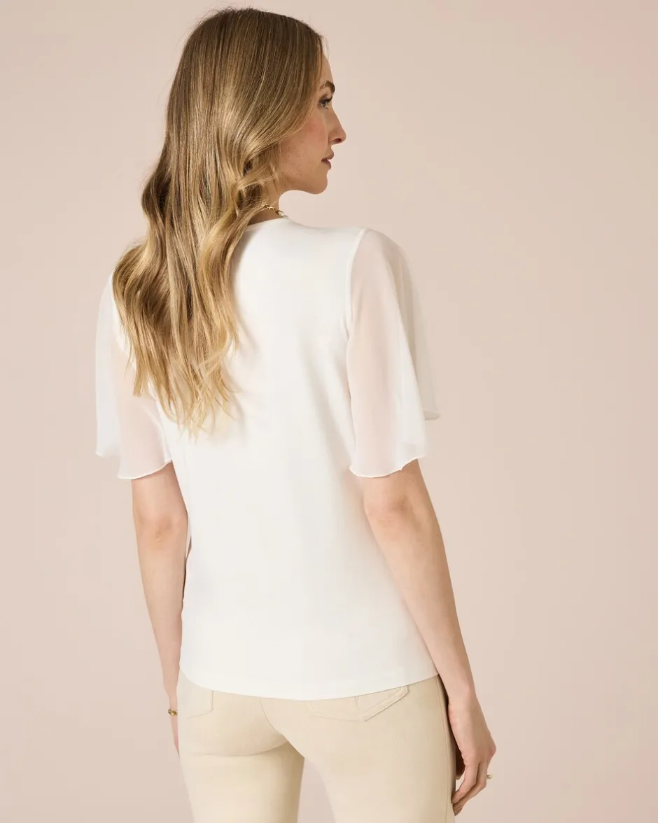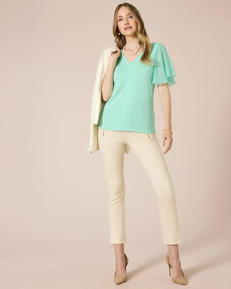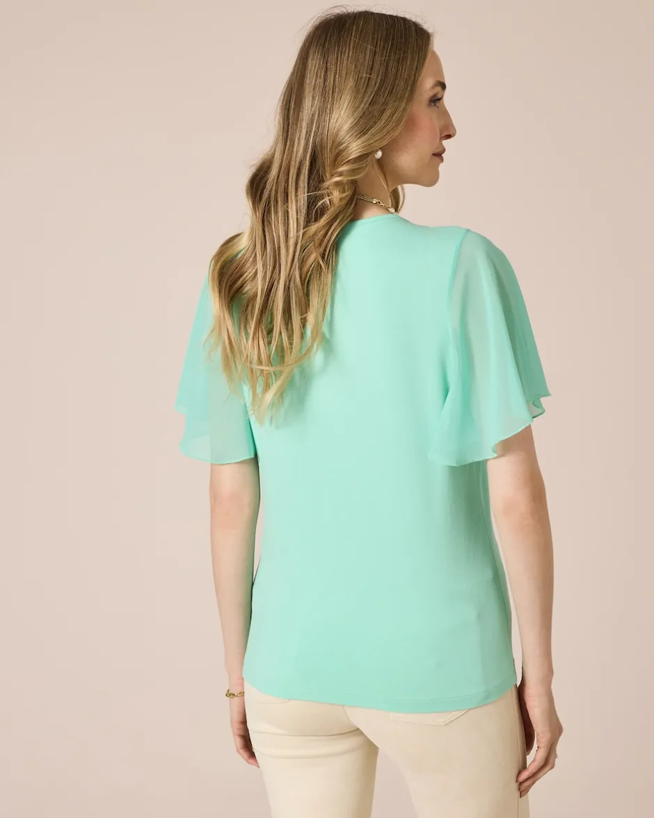 So elegant kann eine Schlupfbluse sein. Mit seinen leicht durchsichtigen Ärmeln und dem tiefen V-Ausschnitt ist dieser Style ein echter Hingucker, der zu schicken Office-Outfits ebenso toll aussieht wie zu sommerlichen Freizeit-Kombis. Als Hauptmaterial wurde eine feine Viskose-Qualität mit leichtem Stretch-Anteil verarbeitet. Die Bluse ist in zwei zarten Pastellfarben erhältlich.
