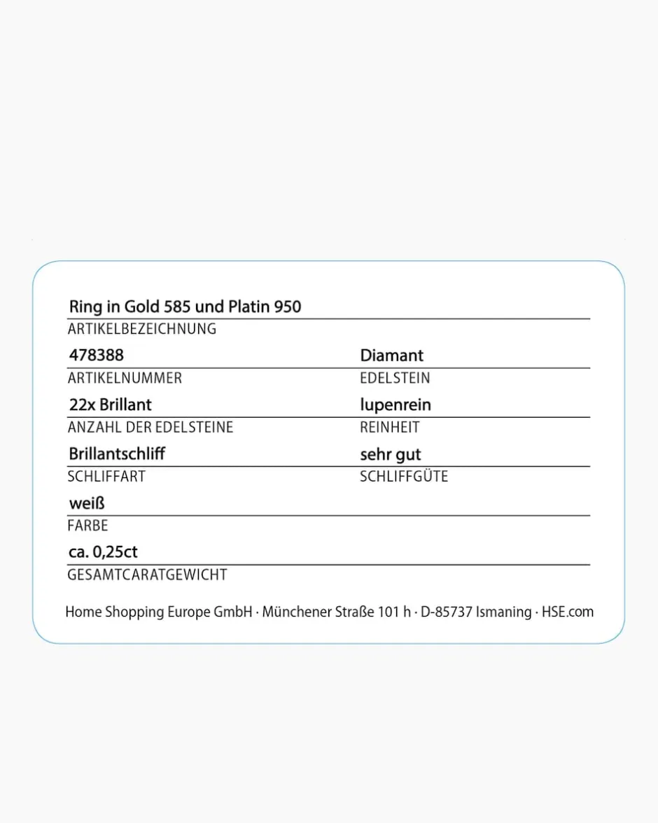 Ist dieser Bicolor-Ring nicht bezaubernd? Der Ring mit modisch breiter Ringschiene ist aus kühl-elegantem Platin 950 und warm schimmerndem Gelbgold 585 designt. In die hochglanzpolierte bzw. mattierte Oberfläche sind 22 lupenreine Brillanten eingerieben. Die weißen Brillanten sind von sehr guter Schliffqualität und im Brillantschliff veredelt. Stellen Sie sich den unwiderstehlichen Lichterglanz vor, der jede Ihrer Gesten unterstreicht. Erleben Sie den luxuriösen Charme dieses märchenhaft schönen Rings.